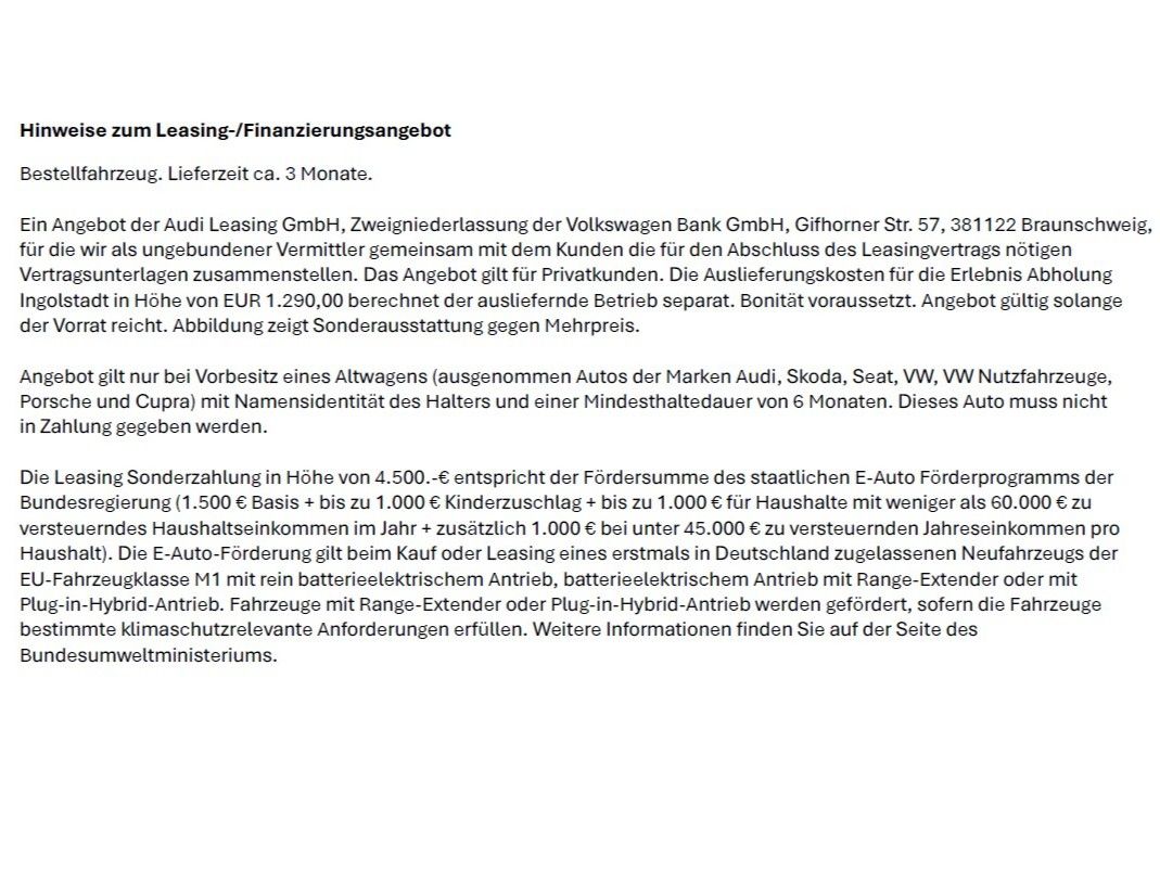 Bestellfahrzeug. Lieferzeit ca.3 Monate. Ein Angebot der Audi Leasing GmbH| Zweigniederlassung der Volkswagen Bank GmbH| Gifhorner Str. 57| 381122 Braunschweig| für die wir als ungebundener Vermittler gemeinsam mit dem Kunden die für den Abschluss des Leasingvertrags nötigen Vertragsunterlagen zusammenstellen. Das Angebot gilt für Privatkunden. Bonität voraussetzt. Angebot gültig solange der Vorrat reicht. Abbildung zeigt Sonderausstattung gegen Mehrpreis. Die Auslieferungskosten für die Erlebnis Abholung Ingolstadt in Höhe von 1.290|00 Euro berechnet der ausliefernde Betrieb separat. Die Leasing Sonderzahlung in Höhe von 6.000.-€ entspricht beispielsweise der maximale Fördersumme des staatlichen E-Auto Förderprogramms der Bundesregierung (3.000 € Basis + bis zu 1.000 € Kinderzuschlag + bis zu 1.000 € für Haushalte mit weniger als 60.000 € zu versteuerndes Haushaltseinkommen im Jahr + zusätzlich 1.000 € bei unter 45.000 € zu versteuerndes Jahreseinkommen pro Haushalt). Die E& 8209,Auto-Förderung gilt beim Kauf oder Leasing eines erstmals in Deutschland zugelassenen Neufahrzeugs der EU-Fahrzeugklasse M1 mit rein batterieelektrischem Antrieb| batterieelektrischem| Antrieb mit Range-Extender oder mit Plug-in-Hybrid-Antrieb. Fahrzeuge mit Range-Extender oder Plug-in-Hybrid-Antrieb werden gefördert| sofern die Fahrzeuge bestimmte| klimaschutzrelevante Anforderungen erfüllen. Weitere Informationen finden Sie auf der Seite des Bundesumweltministeriums. Angebot gilt nur bei Vorbesitz eines Altwagens (ausgenommen Autos der Marken Audi| Skoda| Seat| VW| VW Nutzfahrzeuge| Porsche und Cupra) mit Namensidentität des Halters und einer Mindesthaltedauer von 6 Monaten. Dieses Auto muss nicht in Zahlung gegeben werden.