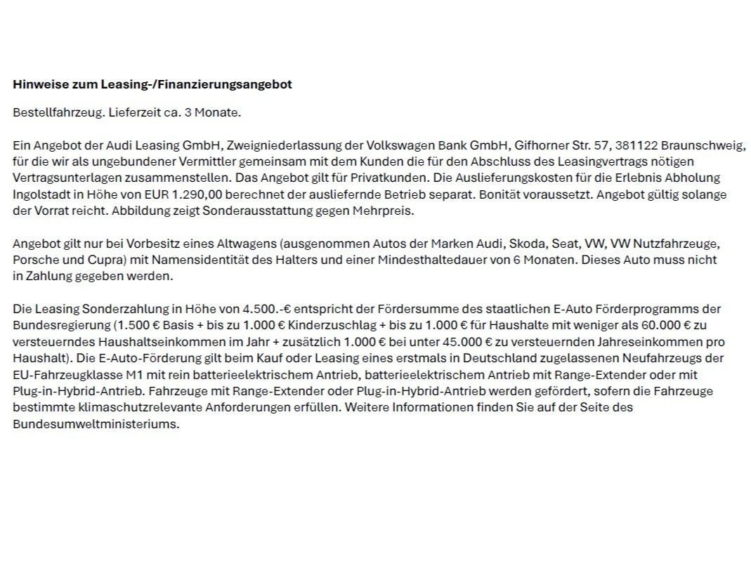 Bestellfahrzeug. Lieferzeit ca. 6 Monate. Ein Angebot der Audi Leasing GmbH| Zweigniederlassung der Volkswagen Bank GmbH| Gifhorner Str. 57| 381122 Braunschweig| für die wir als ungebundener Vermittler gemeinsam mit dem Kunden die für den Abschluss des Leasingvertrags nötigen Vertragsunterlagen zusammenstellen. Das Angebot gilt für Privatkunden und gewerbliche Einzelabnehmer mit Ausnahme von Sonderkunden für ausgewählte Modelle. Bonität voraussetzt. Angebot gültig solange der Vorrat reicht. Abbildung zeigt Sonderausstattung gegen Mehrpreis. Die Auslieferungskosten für| die Erlebnis Abholung Ingolstadt in Höhe von 1.290|00 Euro berechnet der ausliefernde Betrieb separat. Angebot gilt nur bei Vorbesitz eines Altwagens (ausgenommen Autos der Marken Audi| Skoda| Seat| VW| VW Nutzfahrzeuge| Porsche und Cupra) mit Namensidentität des Halters und einer Mindesthaltedauer von 6 Monaten. Dieses Auto muss nicht in Zahlung gegeben werden. Die Sonderzahlung i. H. v. 4.500|00 € entspricht der maximalen Fördersumme des staatlichen E-Auto-Förderprogramms der Bundesregierung für Hybrid Fahrzeuge. Nur für Privatkunden. Die E Auto-Förderung gilt beim Kauf oder Leasing eines erstmals in Deutschland zugelassenen Neufahrzeugs der EU-Fahrzeugklasse M1 mit rein batterieelektrischem Antrieb| batterieelektrischem Antrieb mit Range-Extender oder mit Plug-in-Hybrid-Antrieb. Fahrzeuge mit Range-Extender oder Plug-in-Hybrid-Antrieb werden gefördert| sofern die Fahrzeuge bestimmte klimaschutzrelevante Anforderungen erfüllen. Weitere Informationen finden Sie auf der Seite des Bundesumweltministeriums.