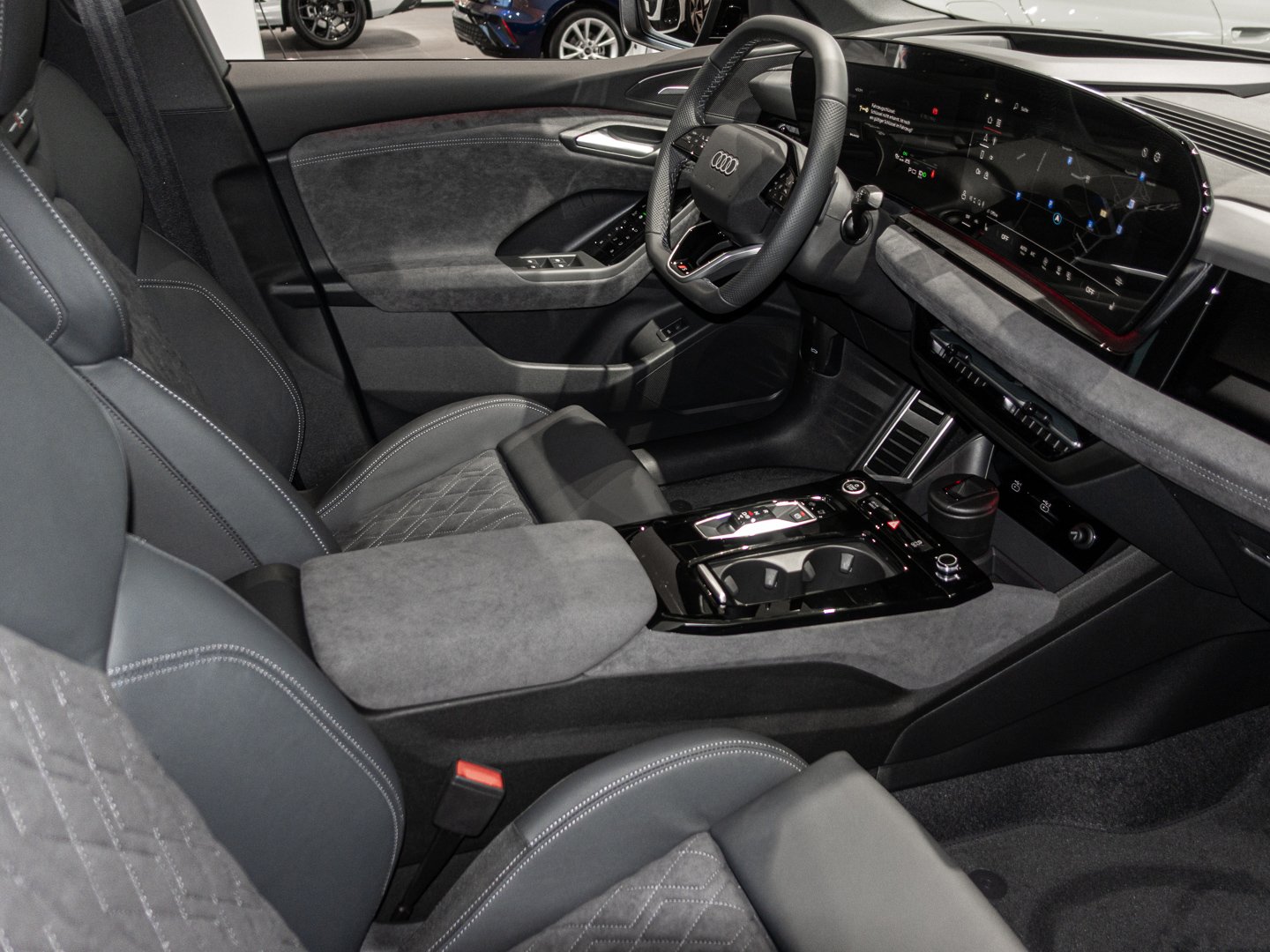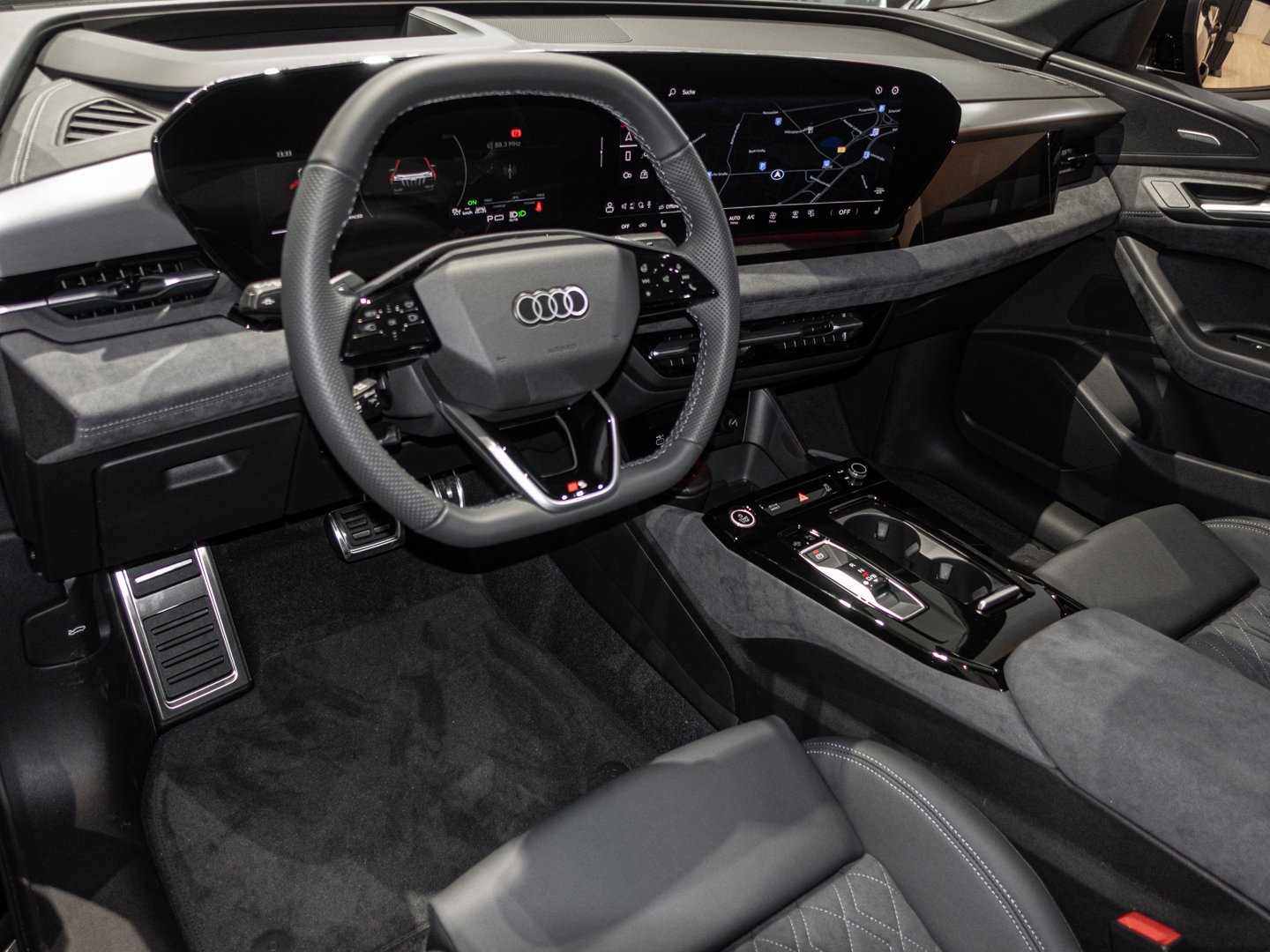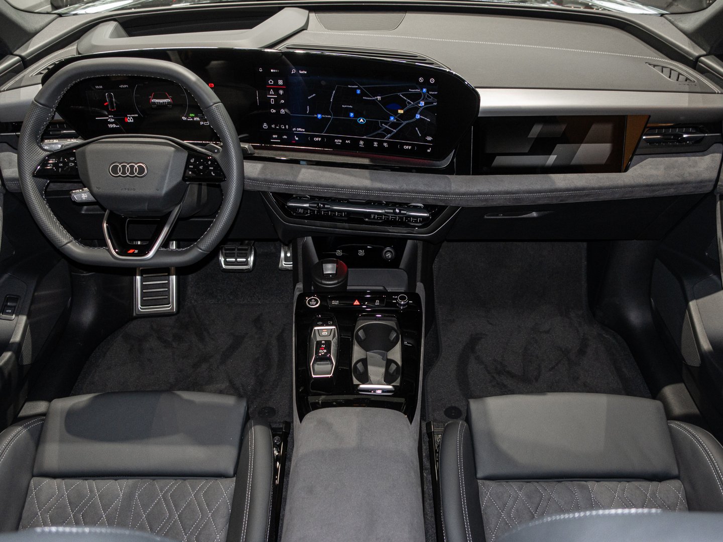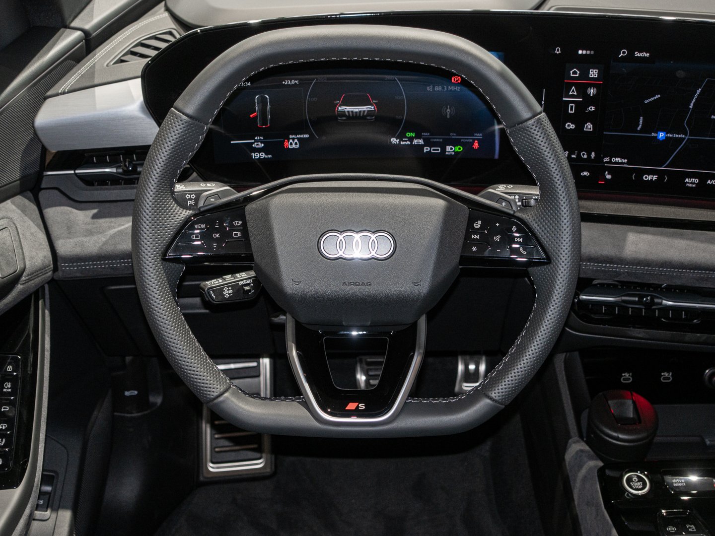 1J2 Projektionsleuchte in den Außenspiegeln, 1XY Sportlederlenkrad 3-Speichen oben und unten abgeflacht mit Multifunktion und Schaltwippen, 2F1 Digitaler Schlüssel, 4G3 Ausweichassistent und Abbiegeassistent vorn, 4GQ Wärmeschutz- und Akustikverglasung Frontscheibe, 4ZP Fensterzierleisten und Anbauteile dunkel, 5P2 Insassenerkennung im Fond, 6F7 Lenkradapplikation Chromoptik S-Emblem Lenkradgriffe perforiertes Leder und Kontrastnaht, 79H Spurwechsel- und Ausstiegswarnung Querverkehrassistent hinten und Abbiegeassistent hinten, 7W7 Proaktiver Insassenschutz Front Seite und Heck, 8G4 Matrix-Funktion, 98S MMI experience pro, 99I Assistenzpaket Schutz- und Warnsysteme plus, 9X0 Einparkhilfe plus mit Distanzanzeige, 9ZE Telefonablage mit induktiver Ladefunktion und Mobilfunk-Koppelantenne, EM2 Aufmerksamkeits- und Müdigkeitserkennung, FP1 FOD Funktionen online verfügbar, GS5 Akzentflächen und Bedientasten schwarz glänzend, JH1 MMI Beifahrerdisplay, JX1 Querverkehrassistent vorn, LT2 Verkehrszeichenbasierter Geschwindigkeitsbegrenzer, PY2 Exterieur S line, PYH MMI experience pro, U9E USB-Schnittstellen mit erhöhter Ladeleistung, 2C5 Lenkradeinstellung manuell, 8VP LED-Heckleuchten pro, 99B Assistenzpaket Fahren und Parken, 98C Komfortpaket 2 ( Nur für Audi / Bentley / Nutzfahrzeuge ), GA2 Komfort-Standklimatisierung, 2W9 Ladeklappe elektrisch, 7HB Instrumententafel-Oberseite schwarz mit Kontrastnaht, 8IY LED-Scheinwerfer plus, 98G Klimatisierungspaket Winter, 98V Ladepaket Basis ( Nur für Audi ), J9G Hochvolt-Batterie 100 kWh (brutto), LH3 Maximal mögliche Ladeleistung (DC), LW1 Digitale Lichtsignaturen, AI1 Memory-Funktion für den Fahrersitz und die Außenspiegel, PQB Tech plus, 99W Interieurausstattung 13, 8RT Bang & Olufsen Premium Soundsystem mit 3D-Klang und Kopfstützenlautsprechern, Q8D Interieurelemente oben und unten Mikrofaser Dinamica, T39 Elektro-Motor Aggr.0EL.D, V6C Softwareverbund Ausführung 3, 5TG Dekoreinlage Aluminium matt gebürstet anthrazit, 80J Reifen 255/45 R21 106W xl vorn Reifen 285/40 R21 109W xl hinten, DU4 Elektro-Motor Systemleistung 225 KW Grundmotor ist: N11/N12/T9W/T39, N2S Mikrofaser Dinamica/Leder-Kombination mit Rautensteppung, PWN Interieur S mit Sportsitzen plus Mikrofaser Dinamica/Leder-Kombination schwarz, V39 Räder Audi Sport 5-Y-Speichen-Dynamik schwarz metallic glanzgedreht 9.0 J, 10.0 Jx21 Reifen 255/45, 285/40 R21, VS1 Vorbereitung für intelligente Ladefunktionen, Y4T Mythosschwarz Metallic in Volllackierung