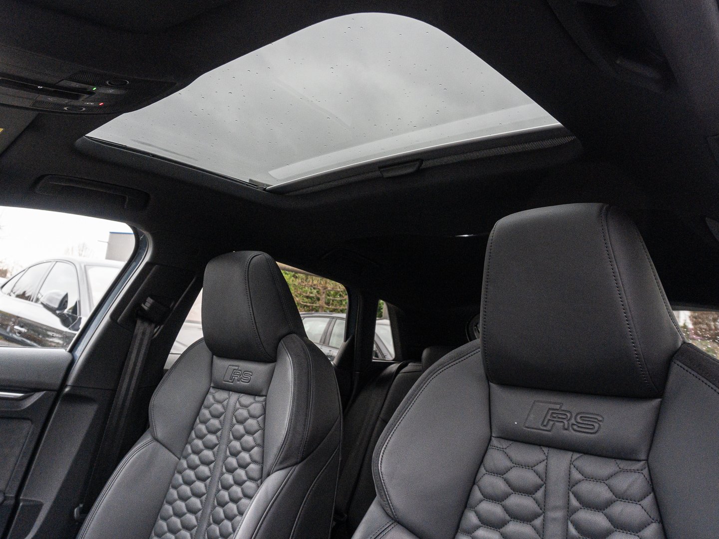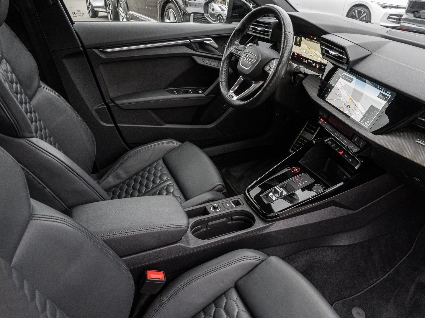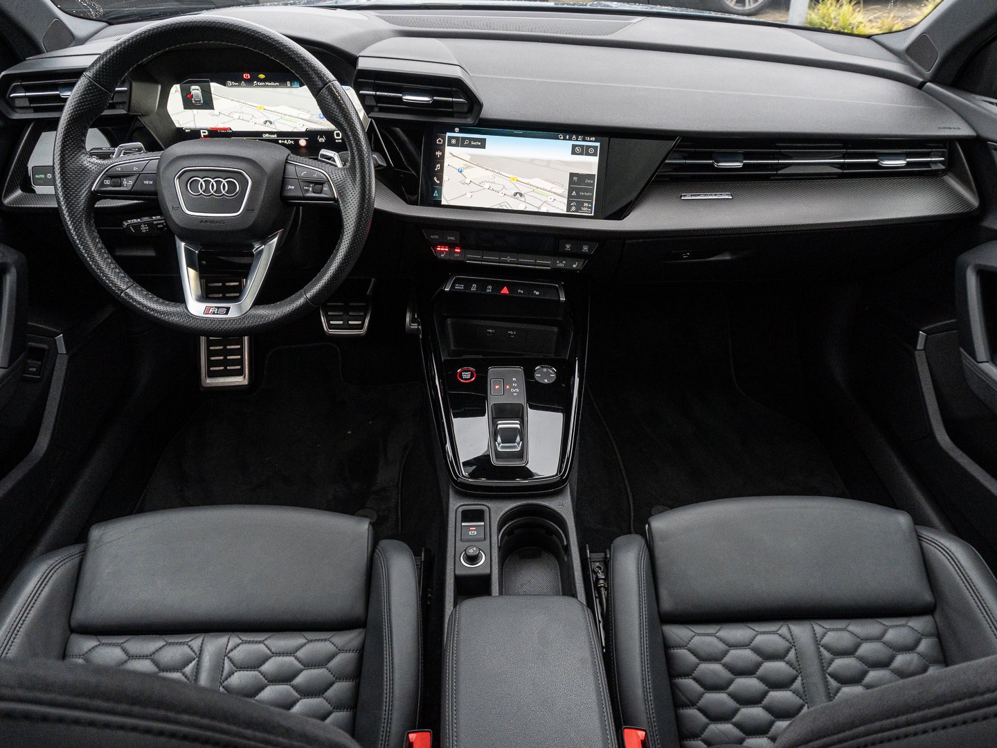 L0L Linkslenker, Q1D Sportsitze vorn, 4UF Airbags vorn Beifahrerairbag deaktivierbar, QQ2 Ambiente-Lichtpaket plus, 4L6 Innenspiegel automatisch abblendend rahmenlos, 3L4 Vordersitze elektrisch einstellbar mit Memory-Funktion für den Fahrersitz, 6E3 Mittelarmlehne vorn, 0P8 RS-Sportabgasanlage, 3NT Rücksitzlehne geteilt umklappbar, 7J3 Audi virtual cockpit plus mit zusätzlichem RS-Layout, 9AK 2-Zonen-Komfortklimaautomatik, 1XX Lederlenkrad 3-Speichen mit Multifunktion plus und Schaltwippen, 4GF Frontscheibe in Wärmeschutzverglasung, 8I6 Lendenwirbelstütze pneumatisch einstellbar mit Massagefunktion für die Vordersitze, PV3 Vordersitze elektrisch einstellbar mit Memory-Funktion für den Fahrersitz und die Außenspiegel, N1H Leder Feinnappa mit Wabensteppung und RS-Prägung, 5L1 RS-Exterieurumfänge in Schwarz matt