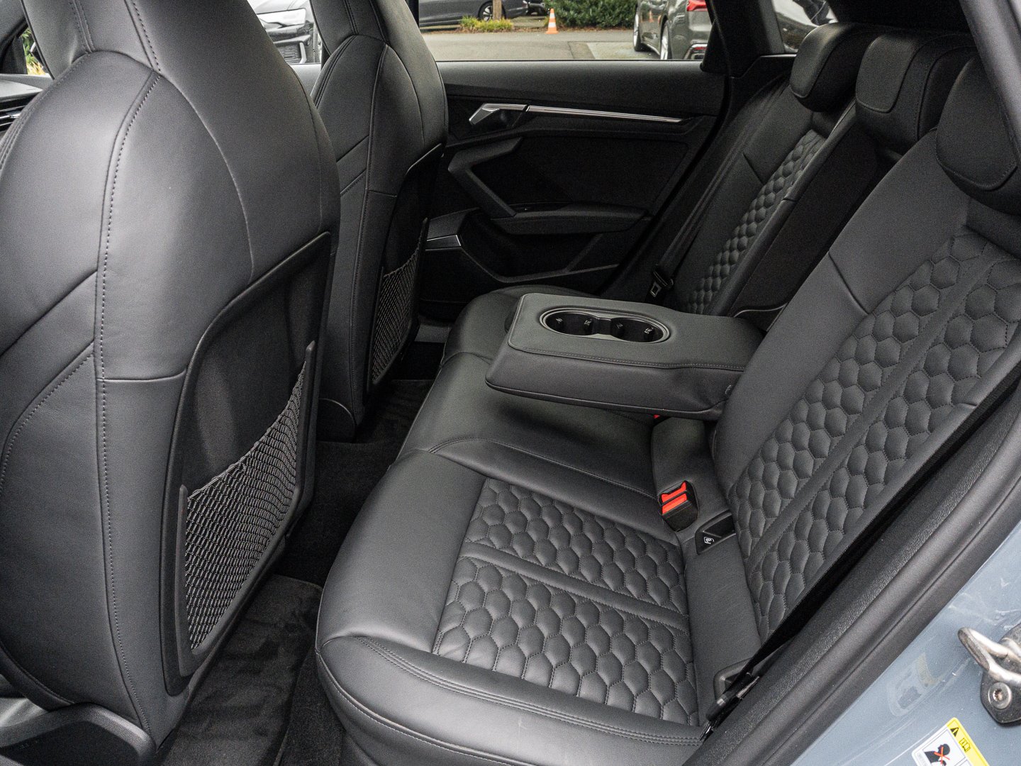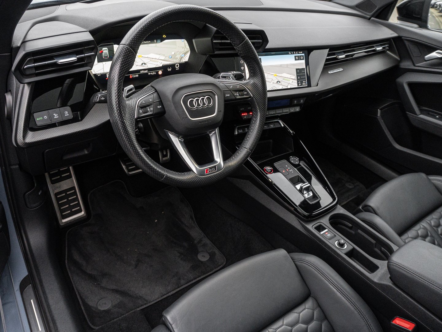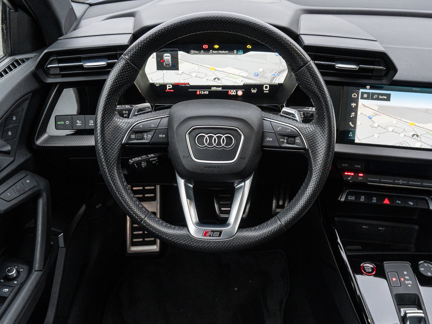 L0L Linkslenker, Q1D Sportsitze vorn, 4UF Airbags vorn Beifahrerairbag deaktivierbar, QQ2 Ambiente-Lichtpaket plus, 4L6 Innenspiegel automatisch abblendend rahmenlos, 3L4 Vordersitze elektrisch einstellbar mit Memory-Funktion für den Fahrersitz, 6E3 Mittelarmlehne vorn, 0P8 RS-Sportabgasanlage, 3NT Rücksitzlehne geteilt umklappbar, 7J3 Audi virtual cockpit plus mit zusätzlichem RS-Layout, 9AK 2-Zonen-Komfortklimaautomatik, 1XX Lederlenkrad 3-Speichen mit Multifunktion plus und Schaltwippen, 4GF Frontscheibe in Wärmeschutzverglasung, 8I6 Lendenwirbelstütze pneumatisch einstellbar mit Massagefunktion für die Vordersitze, PV3 Vordersitze elektrisch einstellbar mit Memory-Funktion für den Fahrersitz und die Außenspiegel, N1H Leder Feinnappa mit Wabensteppung und RS-Prägung, 5L1 RS-Exterieurumfänge in Schwarz matt