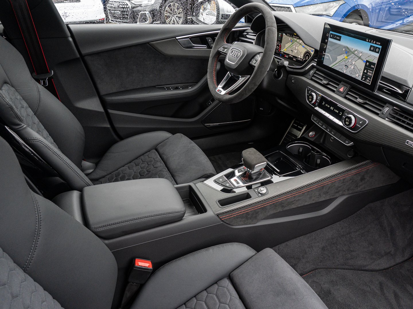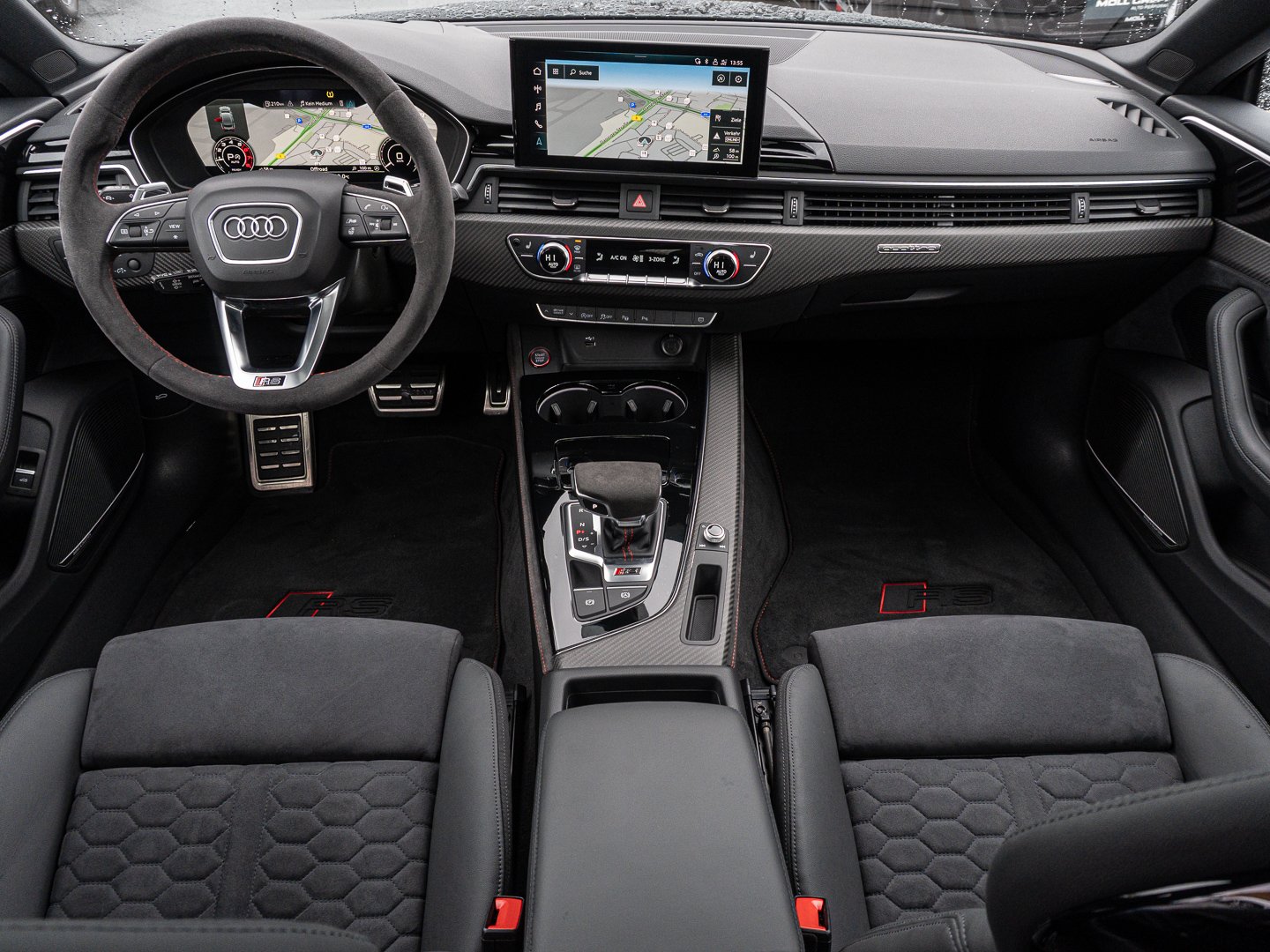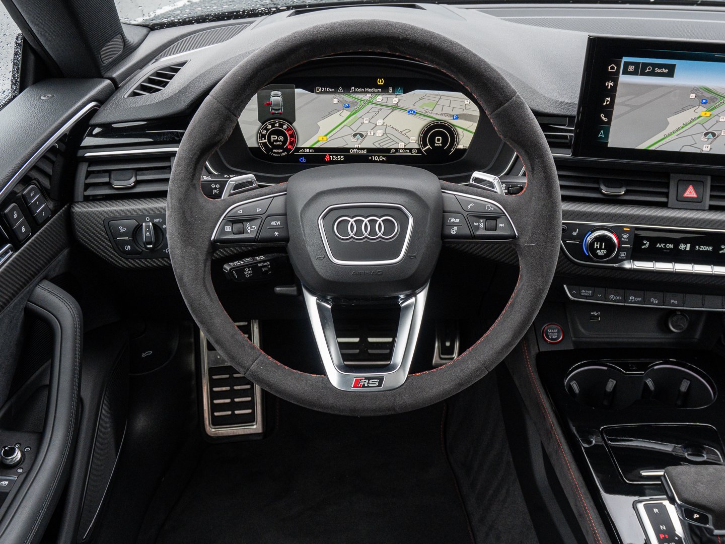 L0L Linkslenker, 9AQ 3-Zonen-Komfortklimaautomatik, 4UF Airbags vorn Beifahrerairbag deaktivierbar, 6E3 Komfortmittelarmlehne vorn, QQ2 Ambiente-Lichtpaket plus, 4L6 Innenspiegel automatisch abblendend rahmenlos, 3L4 Vordersitze elektrisch einstellbar mit Memory-Funktion für den Fahrersitz, Q4Q Sportsitze plus vorn, 7J3 Audi virtual cockpit plus mit zusätzlichem RS-Layout, 6XL Außenspiegel elektrisch einstell- beheiz- und anklappbar beidseitig automatisch abblendend mit Memory-Funktion, 8I6 Lendenwirbelstütze pneumatisch einstellbar mit Massagefunktion für die Vordersitze, 1XP Lederlenkrad im 3-Speichen-Design mit Multifunktion plus und Lenkradheizung, 2MC RS-Sportfahrwerk plus mit Dynamic Ride Control (DRC)