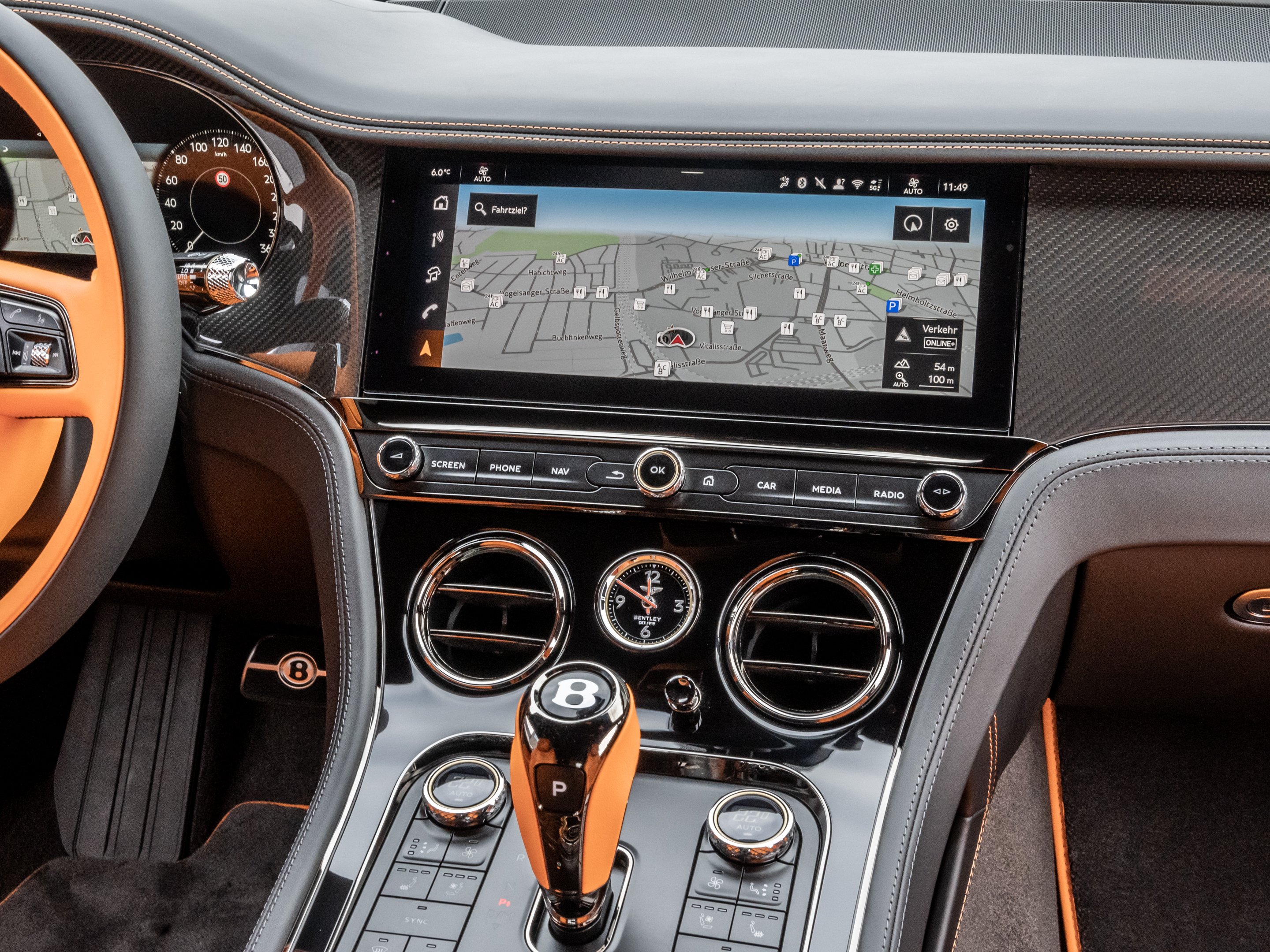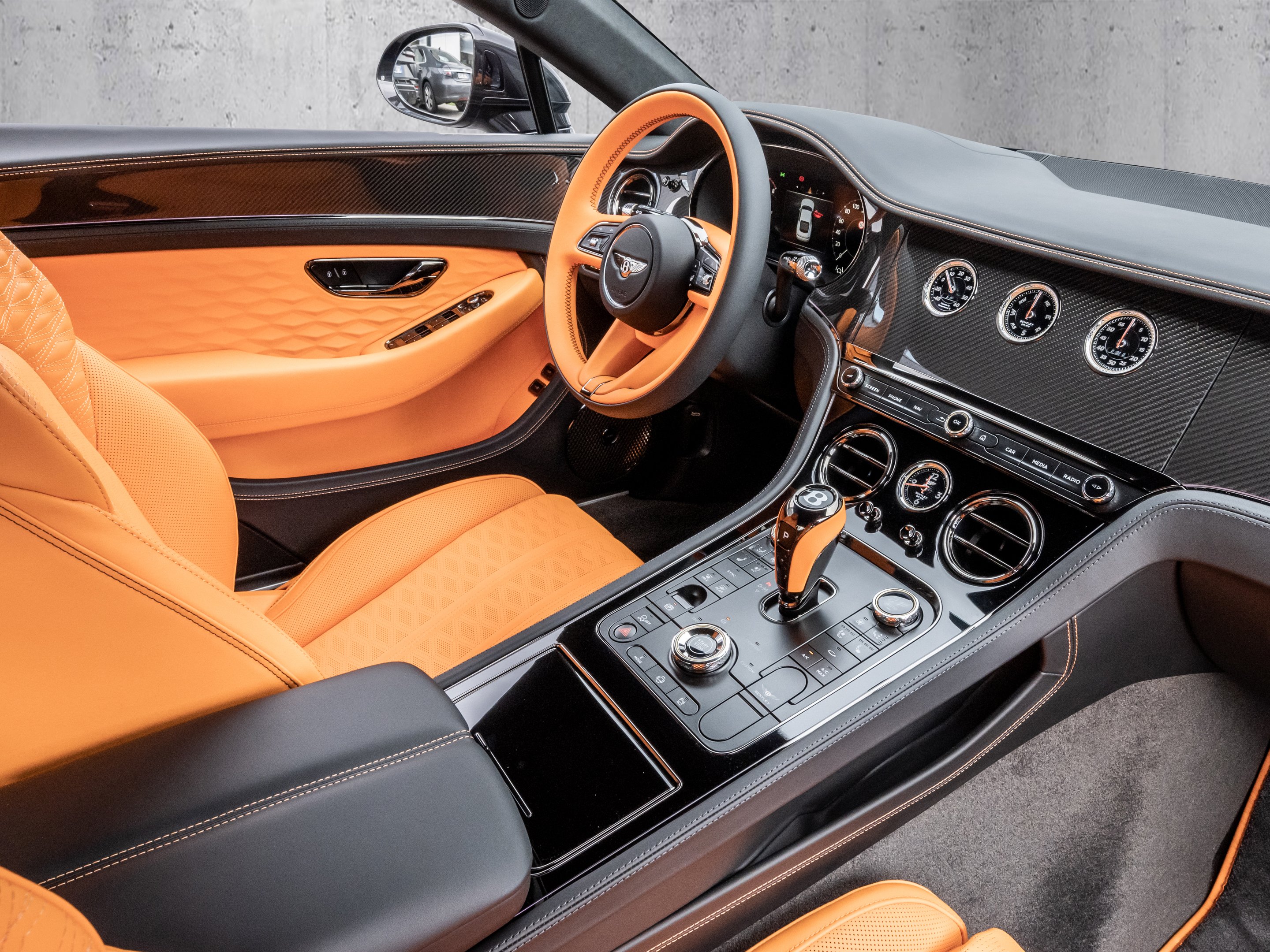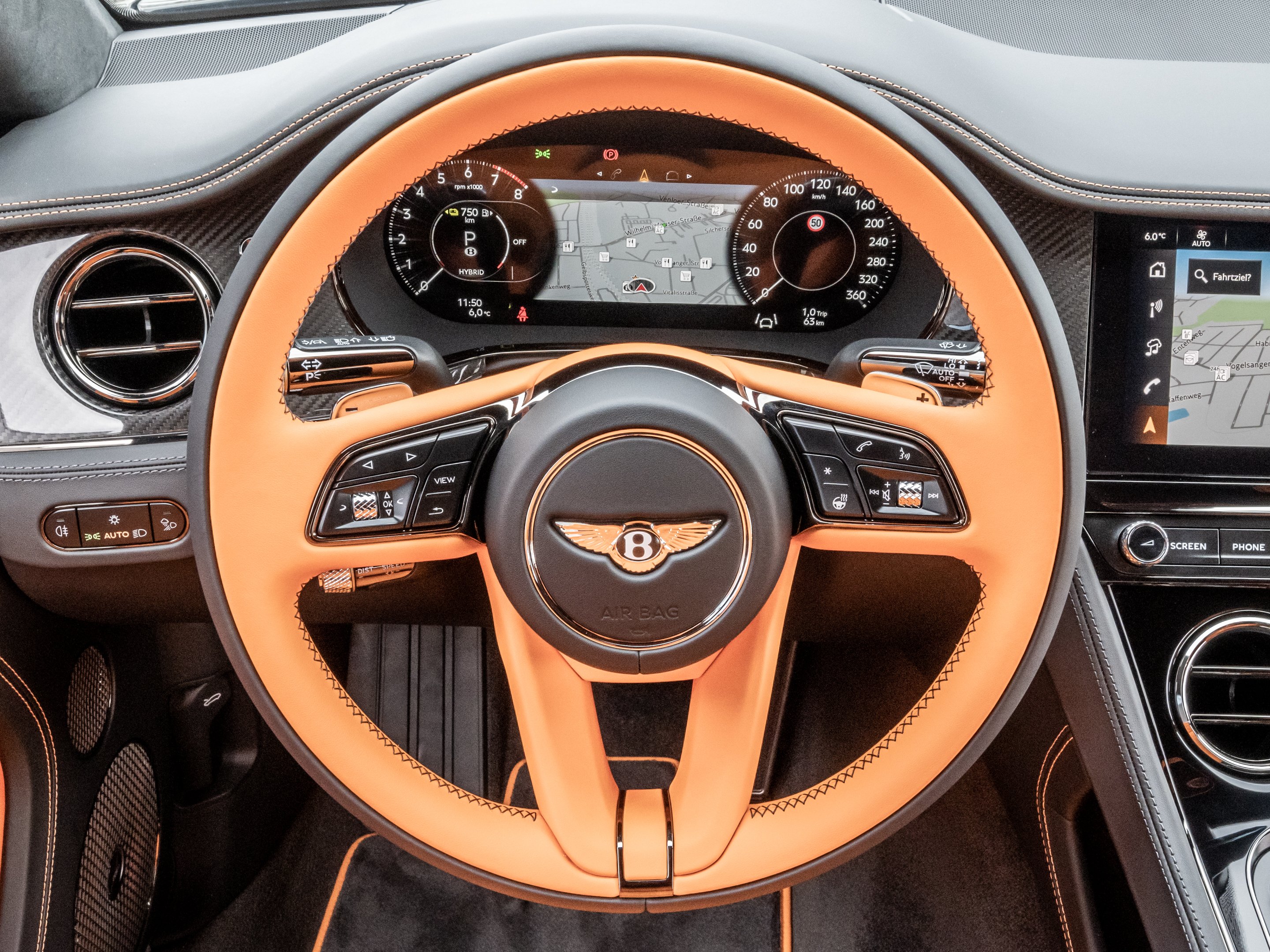 Aussenspiegel el. verstellbar und beheizbar, 360 Grad Kamera, Memorysitze (Fahrer+Beifahrer), Mulliner Range - Solid and Metallic, Touring Specification, Naim for Bentley, Mulliner Colour Specification, 22'' Speed Wheel - Black Painted, Dark Chrome Interior Specification, Leather Specification, Bentley Self Levelling Wheel Badge, Bentley Wings Welcome Lamps, Front Seat Comfort Specification, Continental Blackline Specification, Bentley Rotating Display, Secondary Hide: Beluga, Mood Lighting Specification, Model Year 2026, Deep Pile Overmats - Front, Contrast Stiching, Paint: Royal Ebony, Main Hide: Mandarin, Panoramic Glas Roof, Standard Brakes with Mandarin Brake Calippers - by Mulliner, Bodykit - Accent Pinstripe - by Mulliner, Contrast Binding to Carpet Overmats - match to Contrast Stiching, Singe Finish - High Gloss Carbon Fibre