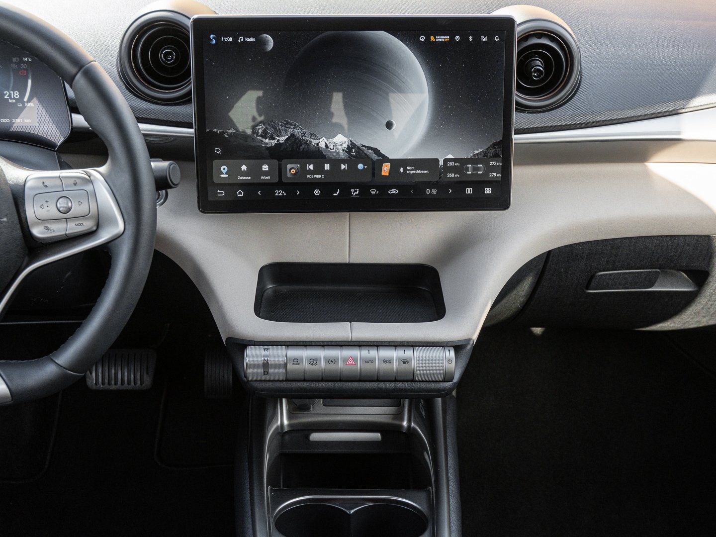 Kamerasystem Surround View 360, Vehicle-to-Load Stecker (V2L), Sitz vorn links elektr. verstellbar (6-fach), Digitaler Fahrzeugschlüssel im Smartphone, Einparkhilfe vorn 2 Sensoren, Elektromotor 150 kW (cont. 65 kW), Instrumentenanzeige TFT-Farbdisplay (5.0 Zoll), Intelligente Adaptive Geschwindigkeitsregelanlage (Intelligent Adaptive Cruise Control / I-ACC), Lenkrad (Leder vegan) mit Multifunktion, NFC Schlüsselkarte, Sitz vorn rechts elektr. verstellbar (4-fach), Sitzbezug / Polsterung: Leder vegan, Spurhalteassistent (Lane Departure Prevention), Spurwechselassistent (LDA), Touchscreen (12.8 Zoll) elektrisch drehbar, USB-Anschlüsse (Typ C und Typ A), Einparkhilfe hinten 3 Sensoren, HV-Batterie 60.4 kWh, Intelligenter Geschwindigkeits-Begrenzer (ISLC), Ionisator zur Luftreinigung mit PM 2.5 Luftfilter, LM-Felgen 6.5x17 (zweifarbig), Metallic-Lackierung Cream White, Notfall-Spurhalteassistent (Emergency Lane Keeping ELK), Panoramadach fest (Glas) mit Sonnenblende elektrisch