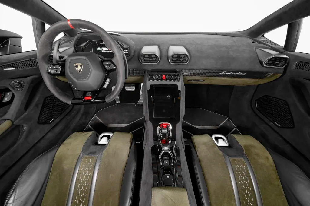 Model Year 2023, Roof Lining and A Pillars in Alcantara, Sport seats, Main Paint - Verde Gea, Air Vents in Carbon Fiber, Rear Wall in Alcantara with the Roof Lining Trim, Steering Wheel in Leather and Central Mark in Red, Roof Rails Black Matt, Lamborghini Rear Logo in Matt Black, Rims 19' Zoll Cerere Casted Titans Matt