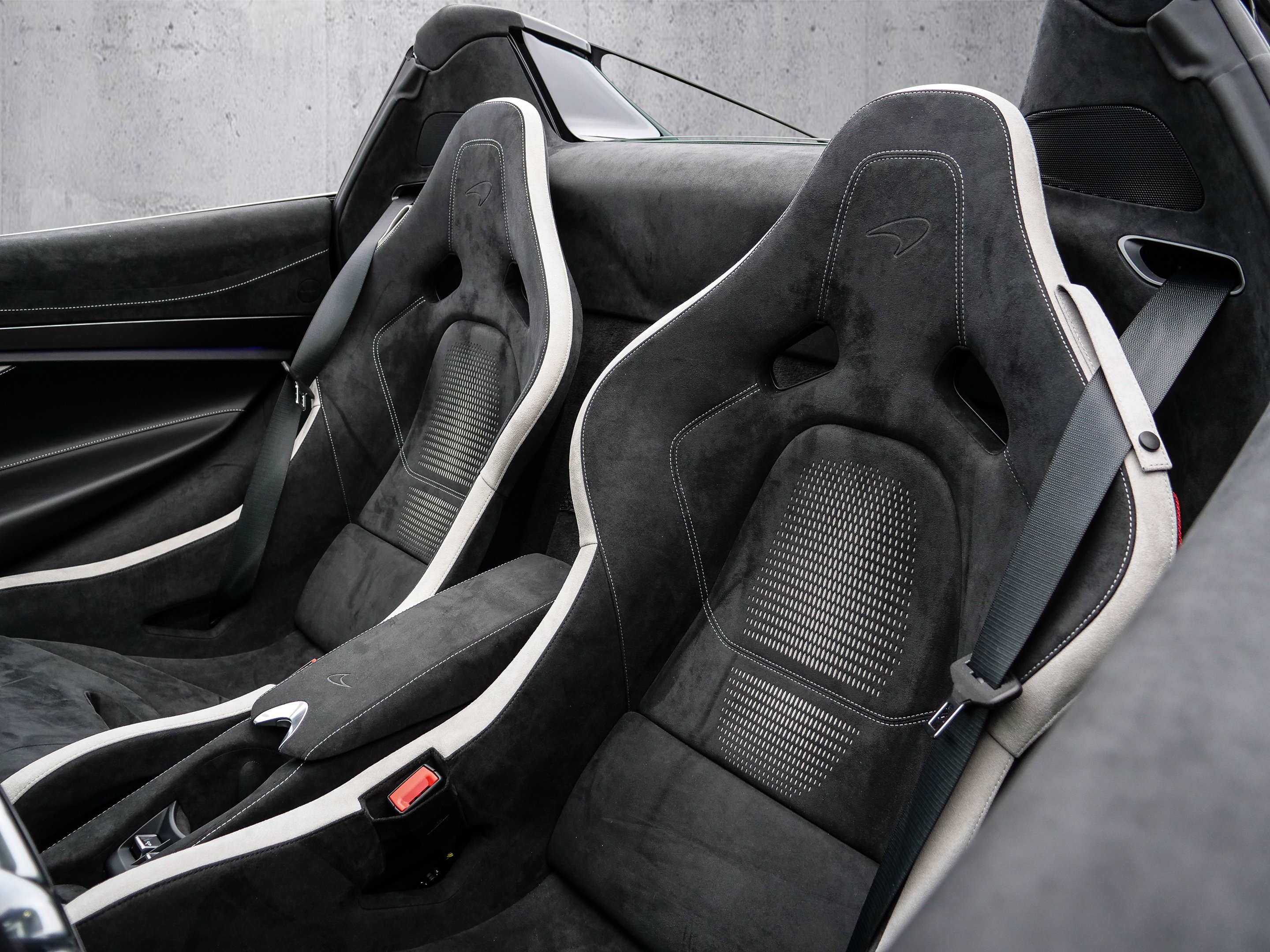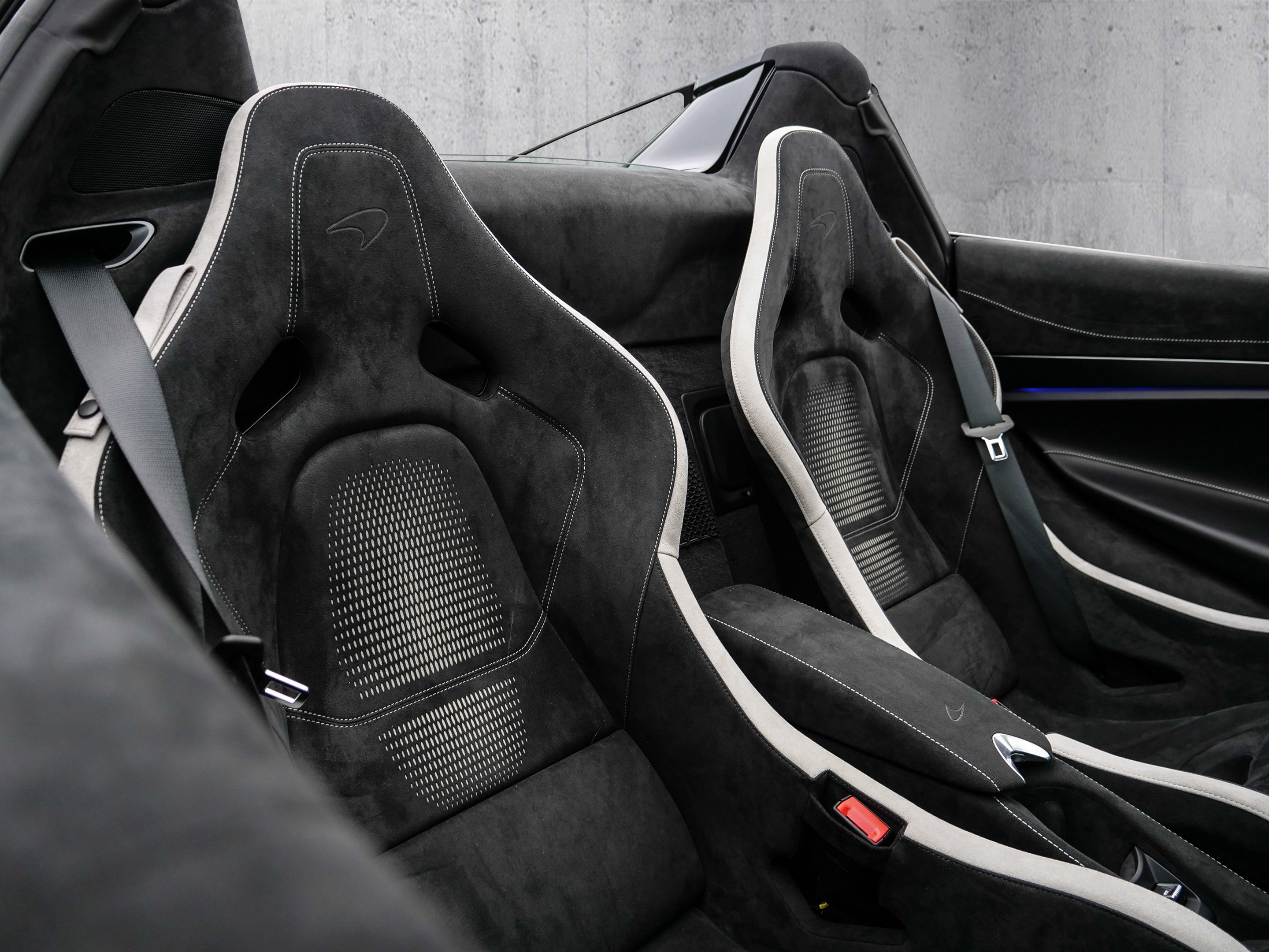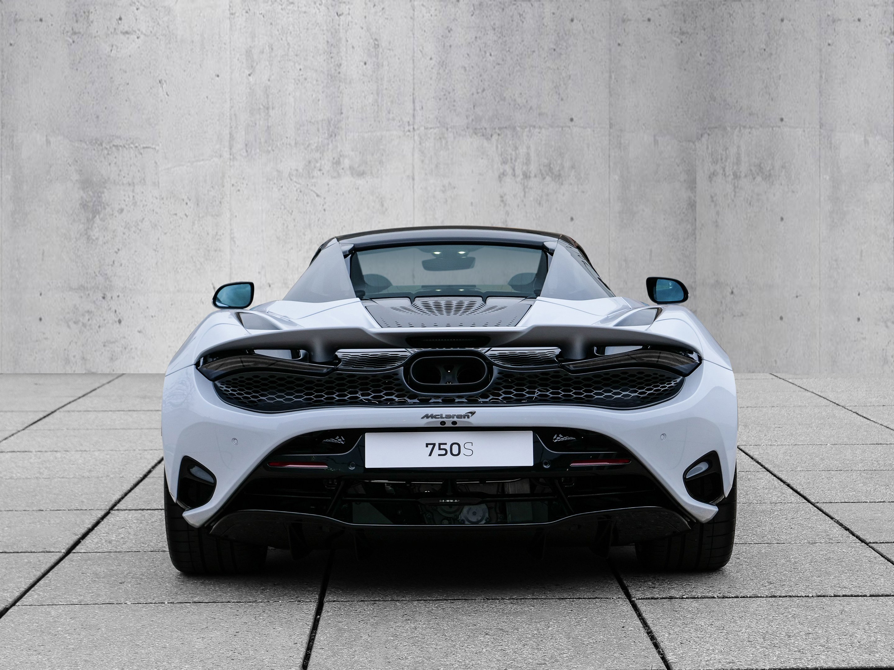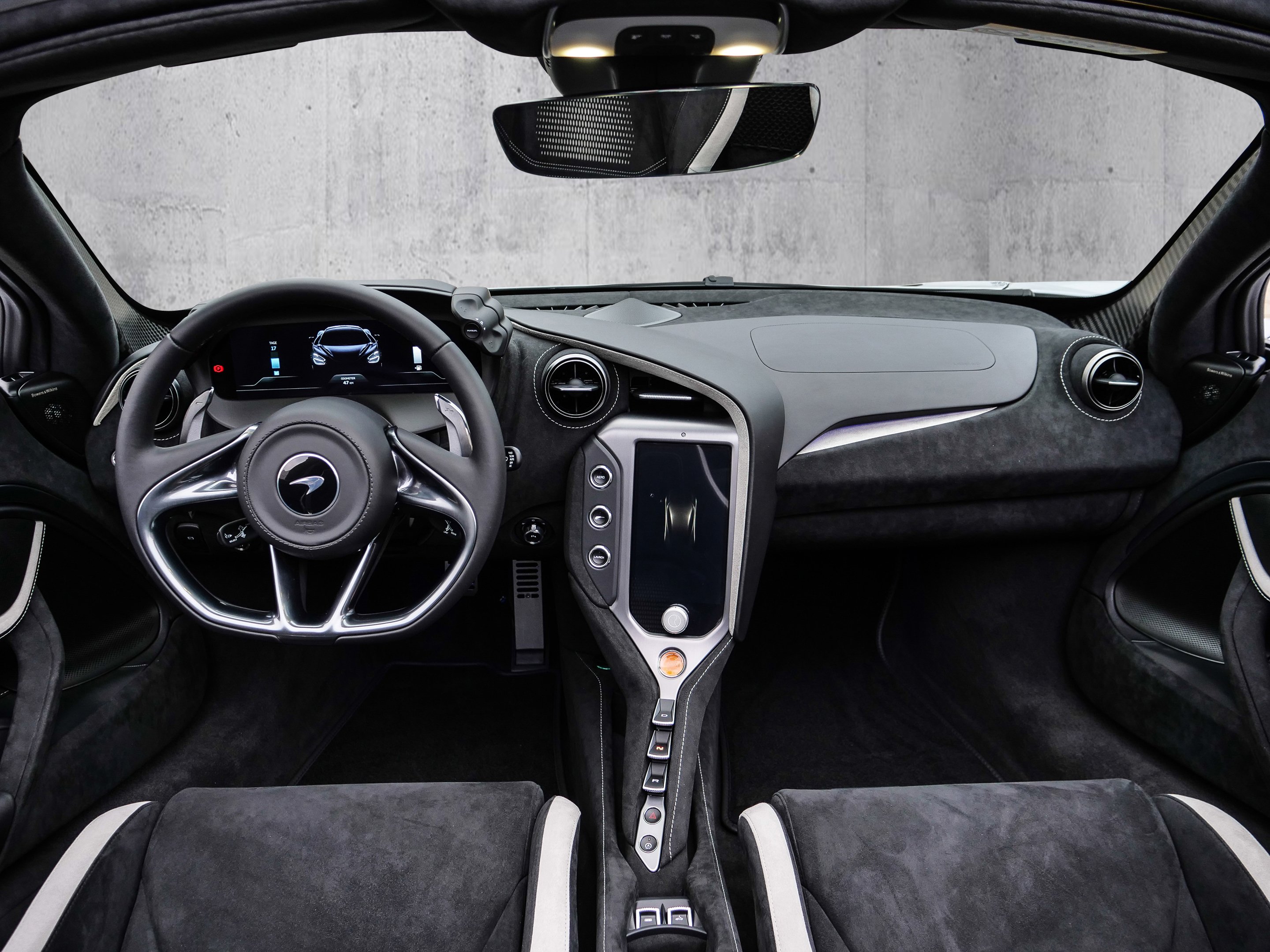 Wheel Finish - Gloss Black, S/Wheel Finish - Jet Black Leather, Stealth Badge Pack, Bowers and Wilkins Audio System 12 Speaker, Hood - Body Colour, Hood Air Intakes - Body Colour, Rear Bumper - BC Upper and GB Lower, Front LTR Exit - Body Colour, Headlight Surround - Gloss Black, Exterior Window Surround - Gloss Black, Body Colour Front Fender with BC Louvres, B-Pillar Outer - Gloss Black, Rear Fender Air Intakes - Body Colour, Active Rear Spoiler - Body Colour, Sound Comfort Windscreen, Sill Trim - Carbon Black Alcantara & Carpet, Steering Wheel - Standard, Steering Wheel Paddles - Satin Graphite, Air Conditioning, 750S Alcantara & Leather Interior, McLaren 750S Spider, Star Forged Wheels- 5 Spoke Ultra-Lightweight, 2026 Model Year, Exterior MSO Paint - Cirrus Grey, 750S Performance Trim - Dove Grey Alcantara & Jet Black Leather, Seat Style - CF Racing Seats, Contrast Stiching - Grey, Calipers - Azure Blue