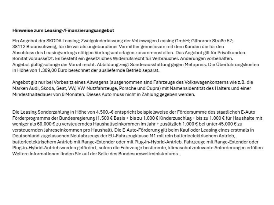 Ein Angebot der SKODA Leasing, Zweigniederlassung der Volkswagen Leasing GmbH, Gifhorner Strasse 57, 38112 Braunschweig, für die wir als ungebundener Vermittler gemeinsam mit dem Kunden die für den Abschluss des Leasingvertrags nötigen Vertragsunterlagen zusammenstellen. Das Angebot gilt für Privatkunden. Bonität voraussetzt. Es besteht ein gesetzliches Widerrufsrecht für Verbraucher. Änderungen vorbehalten. Angebot gültig solange der Vorrat reicht. Abbildung zeigt Sonderausstattung gegen Mehrpreis. Die Überführungskosten in Höhe von 1.309|00 Euro berechnet der ausliefernde Betrieb separat. Änderungen und Irrtümer vorbehalten. Die Leasing Sonderzahlung in Höhe von 4.500.-€ entspricht beispielsweise der Fördersumme des staatlichen E-Auto Förderprogramms der Bundesregierung (1.500 € Basis + bis zu 1.000 € Kinderzuschlag + bis zu 1.000 € für Haushalte mit weniger als 60.000 € zu versteuerndes Haushaltseinkommen im Jahr + zusätzlich 1.000 € bei unter 45.000 € zu versteuerndes Jahreseinkommen pro Haushalt). Die E& 8209,Auto-Förderung gilt beim Kauf oder Leasing eines erstmals in Deutschland zugelassenen Neufahrzeugs der EU-Fahrzeugklasse M1 mit rein batterieelektrischem Antrieb| batterieelektrischem Antrieb mit Range-Extender oder mit Plug-in-Hybrid-Antrieb. Fahrzeuge mit Range-Extender oder Plug-in-Hybrid-Antrieb werden gefördert| sofern die Fahrzeuge bestimmte| klimaschutzrelevante Anforderungen erfüllen. Weitere Informationen finden Sie auf der Seite des Bundesumweltministeriums.| Angebot gilt nur bei Vorbesitz eines Altwagens (ausgenommen sind Fahrzeuge des Volkswagenkonzerns wie z.B. die Marken Audi| Skoda| Seat| VW| VW Nutzfahrzeuge| Porsche und Cupra) mit Namensidentität des Halters und einer Mindesthaltedauer von 6 Monaten. Dieses Auto muss nicht in Zahlung gegeben werden.