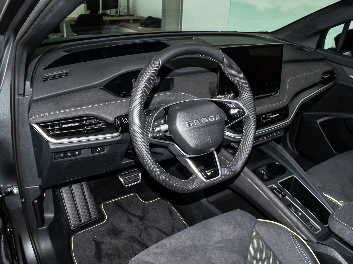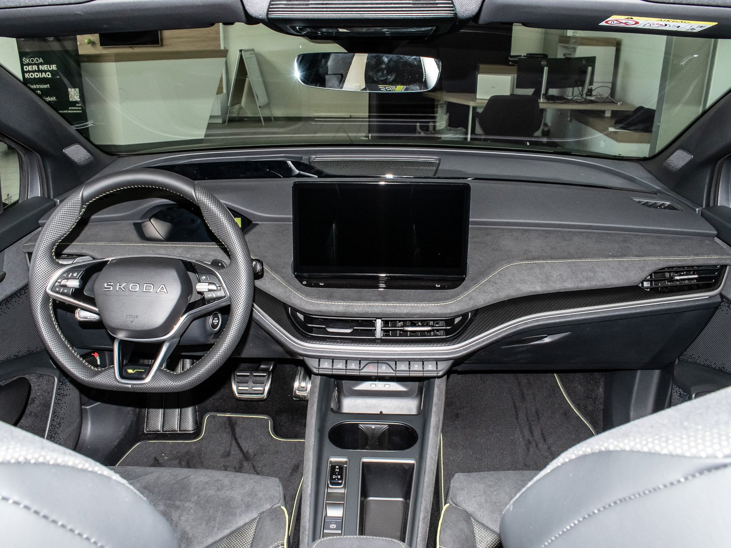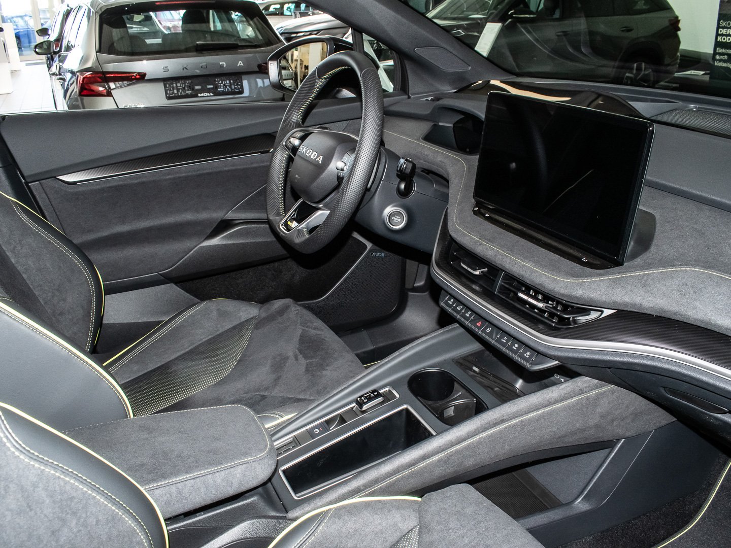 Audio-Navigationssystem mit Touchscreen-Farbdisplay, Induktionsladeschale für Smartphone 15 W, Infotainment-System mit 13 Display, Vorbereitung für Alkohol-Wegfahrsperre (Alcolock), Radstand Standard, Intelligente Geschwindigkeitsanpassung (ISA) inkl. Speed-Limiter, Ablagefächer (Gepäck-/Laderaum), Aussenspiegel schwarz lackiert und Türgriffe aussen in Wagenfarbe, Isofix-Aufnahmen für Kindersitz an Beifahrersitz und Rücksitze aussen (inkl. Top Tether), Rücksitz geteilt / klappbar (60:40) Mittelarmlehne und Durchladefunktion, SKODA Care Connect & Infotainment Online, Sitze vorn höhenverstellbar inkl. Lendenwirbelstütze verstellbar, Elektromotor (System: 250 kW) HA (EDFA), Elektromotor (System: 250 kW) VA (EDDA), Elektromotor 250 kW (cont. 77 kW - Dual-Elektromotor), Kofferraum / Heckklappe elektr. betätigt (öffnen + schliessen), Ausstattungs-Paket: Clever, Easy Start (Keyless Easy Entry), LED-Beleuchtung zwischen Scheinwerfer (Tech-Deck), LM-Felgen vorn/hinten: 8x20 / 9x20 (Draconis Aero - Schwarz - glanzgedreht), Anhängerkupplung mit elektr. Entriegelung - schwenkbar - inkl. Anhängerstabilisierung & Adapter, Ausstattungs-Paket: Plus, Sitze vorn elektr. verstellbar (mit Massagefunktion), Ausstattungs-Paket: Advanced, Design Selection RS Lounge, HV-Batterie 84 kWh brutto / 79 kWh netto, LM-Felgen vorn/hinten: 8.5x21 / 9x21 (Vision Aero - Anthrazit - glanzgedreht), Sitzbezug / Polsterung: Kunstleder / Microfaser schwarz mit Ziernaht in Lime