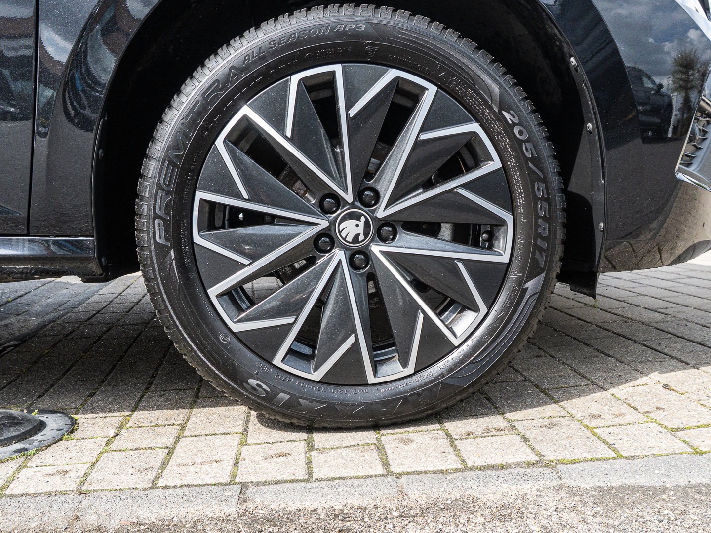EM2 Aufmerksamkeits- und Müdigkeitserkennung, 3GD Doppelboden im Gepäckraum, EF1 Steuerung Fahrprofilauswahl, IN1 Steuerung Hinterachsgewicht, NZ2 Notruffunktion eCall+, QK1 Multifunktionskamera (Für Fahrerassistenzsysteme), 3A2 ISOFIX-Verankerung auf dem Beifahrersitzund den äußeren Rücksitzen inklusive Top-Tether, 7P4 Einstellbare Lendenwirbelstützen in denVordersitzen, 2C5 Lenksäule horizintal- und vertikal einstellbar, 4VN Emissionsnorm EU6e (EB), 7L6 Start-Stopp-Automatik mit Rekuperation (Bremsenergierückgewinnung), 9AK Klimaanlage Climatronic (2-Zonen) mit Allergenfilter und Geruchsfilter, 9S0 10 Digital Cockpit Plus, 5XB Sonnenblenden mit Spiegel auf Fahrerseite, 6XK Elektrisch einstell- beheiz- und anklappbare Außenspiegel, 6FM Steuerung Außenspiegel in Schwarz für Colour Concept, 6M3 Netzprogramm im Gepäckraum, U9E 2 USB-Anschlüsse vorn und 2 USB-Ladeanschlüsse hinten, 6LA Zierleiste im Innenraum in Schwarz glänzend, 7TH Dekorleiste Loft, K8G Karosserievariante CUV, N3A Interieur aus Stoff kombiniert mit hochwertigen Materialien, DS9 1.5l TSI ACT 110 kW / 150 PS, N09 1.5l TSI (4-Zylinder Ottomotor), B01 Steuerung Typprüfland (Deutschland), 42A 17 Leichtmetallfelgen Propus Aero Schwarz glanzgedreht, 7UG Navigationssystem 9.2, 2JW Designelemente am Stoßfänger vorne undhinten in Schwarz