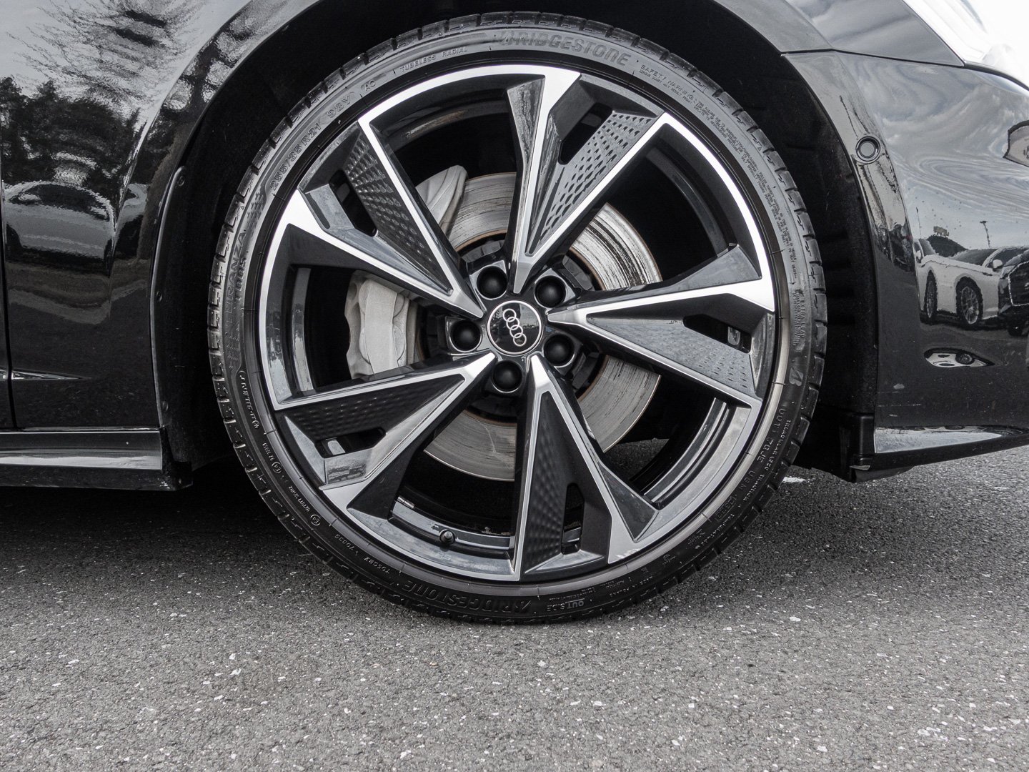 EU6 AP, anthrazitschwarz glanzgedreht 8, Effizienz, beleuchtet vorne mit S-Schriftzug, Reifen 255/35 R21, Beheiz- und anklappbar beidseitig automatisch abblendend mit Memoryfunkt., 5-V-Speichen-Struktur, V60 Räder Audi Sport