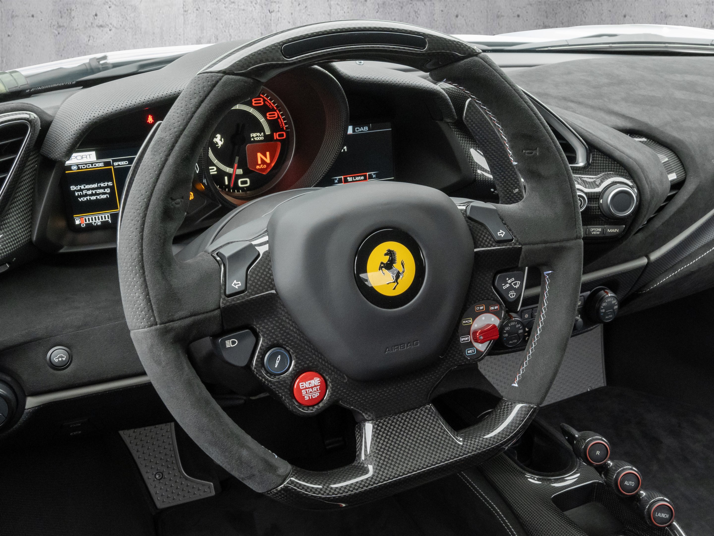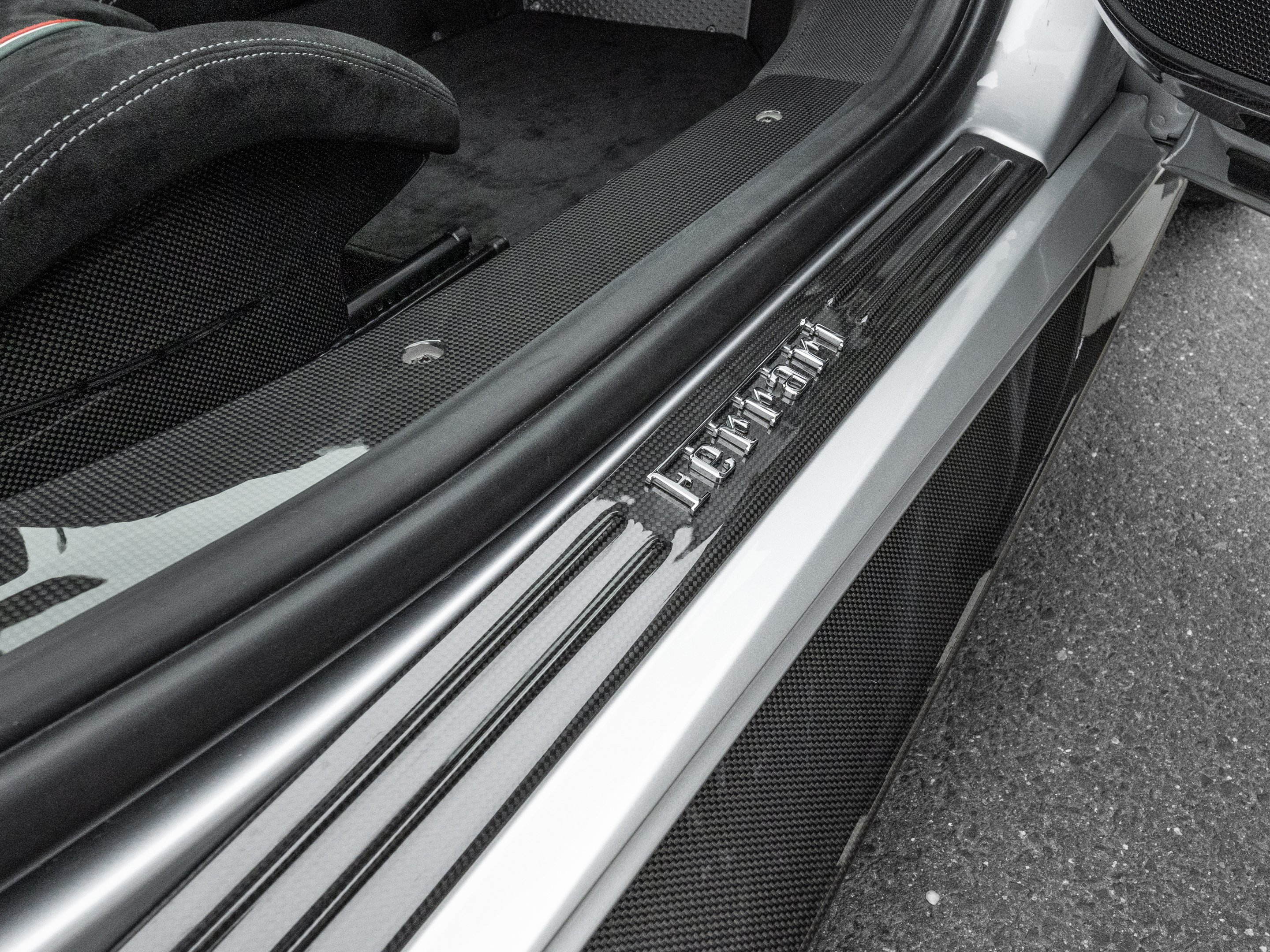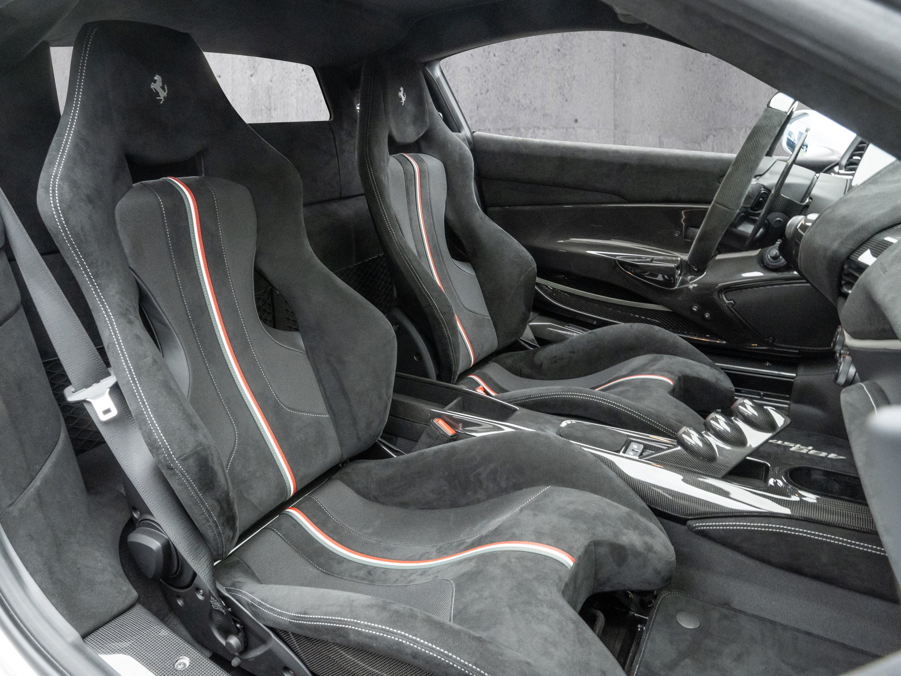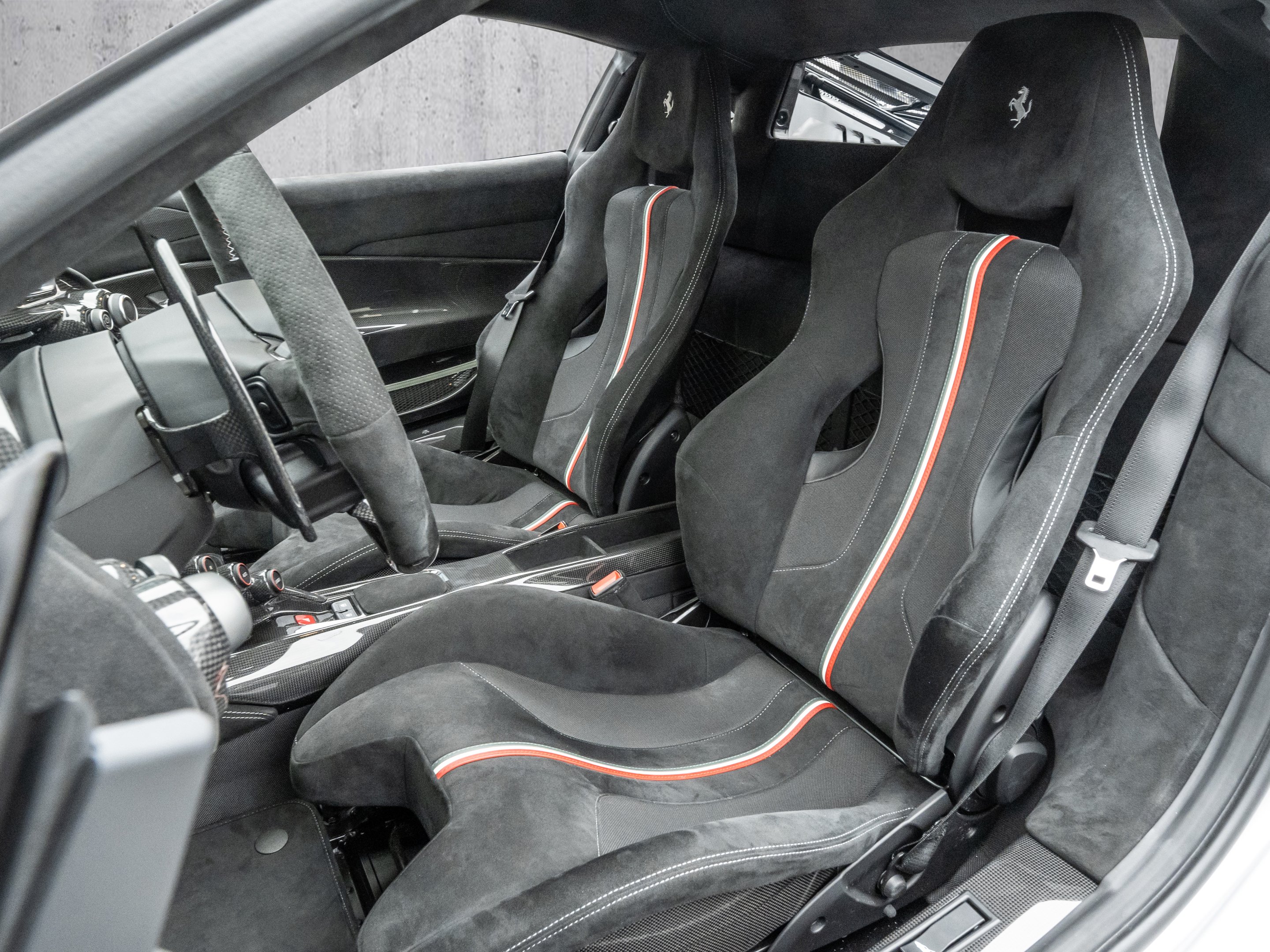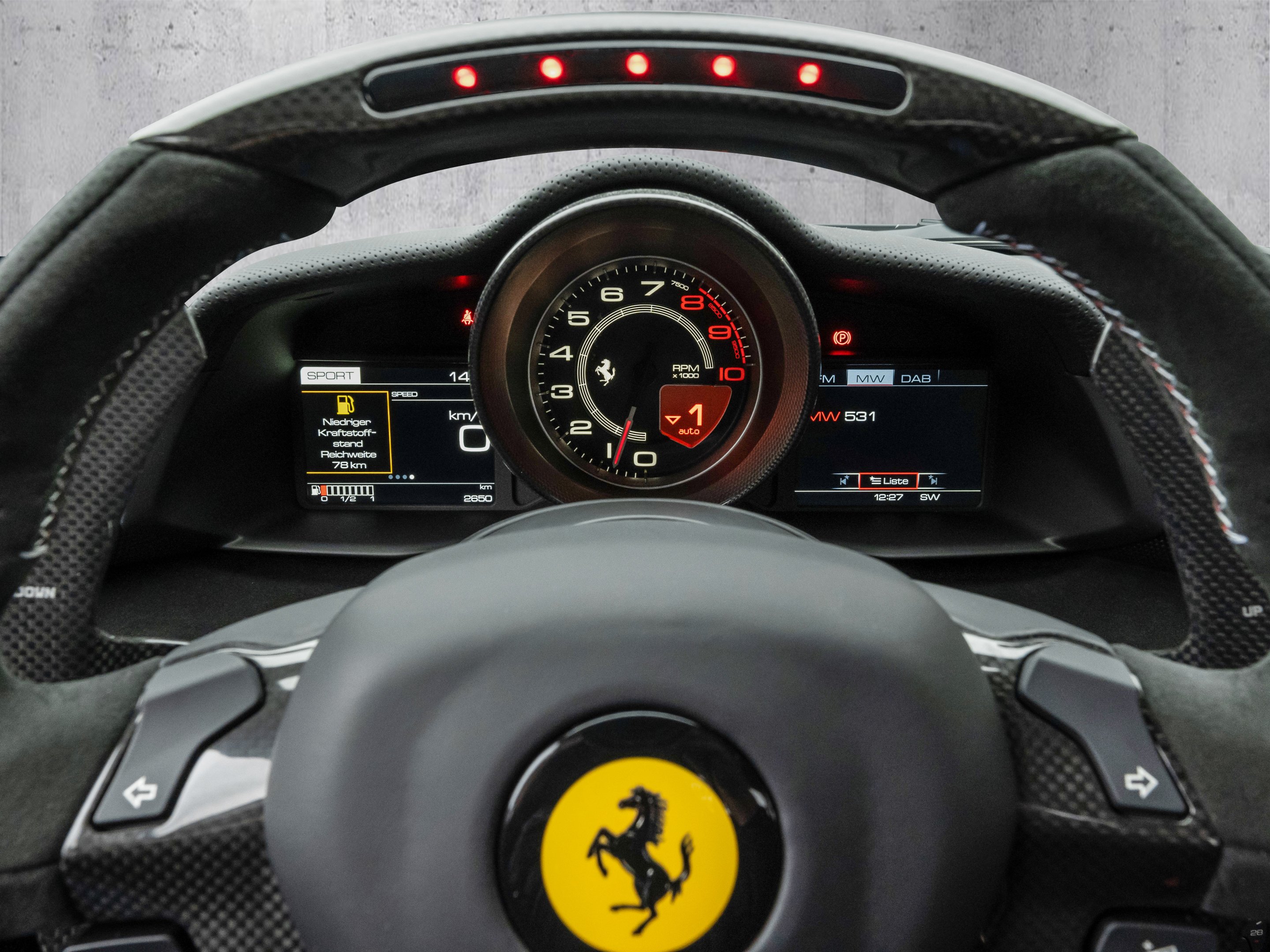Hintere Parkkamera, Bremssättel in Giallo Modena, Spoiler und Klappen vorne aus Carbonfaser, Splitter seitliche Luftklappen aus Carbonfaser, Motorraum aus Carbonfaser, Diffusor aus Carbon, Seitliche Spoiler aus Carbonfaser, Schwellerverkleidung aus Carbonfaser, Auspuffrohre aus Titan, Hinterer Bereich aus Carbonfaser, Scuderia Ferrari Embleme auf den Kotflügeln, Äußere Einstiegsleiste aus Carbonfaser, Finish Carbonfaser oberer Tunnel, Coloured Innenraum-Details, CLDT in Pelle Extracampionaro, Farbe der Bodenverkleidung, Striscia Sedili Pelle Tricolore, Auf die Nackenstütze genahtes Cavallino Rampante, Fußmatten mit gesticktem Fahrzeuglogo, Volante con Cuciture Tricolore, Rennsitze aus Carbonfaser, Sondernähte Farbe nach Wahl, Lenkrad aus Leder in Farbe nach Wunsch, AFS (Adaptive Frontscheinwerfer), Front-Lift, Funktionelle Ausstattung (kein Navigationsgerät), HELE-System (High Emotion Low Emission), Satelliten-Navigationsgerät, Personalisierungspaket, Integriertes Audio-System