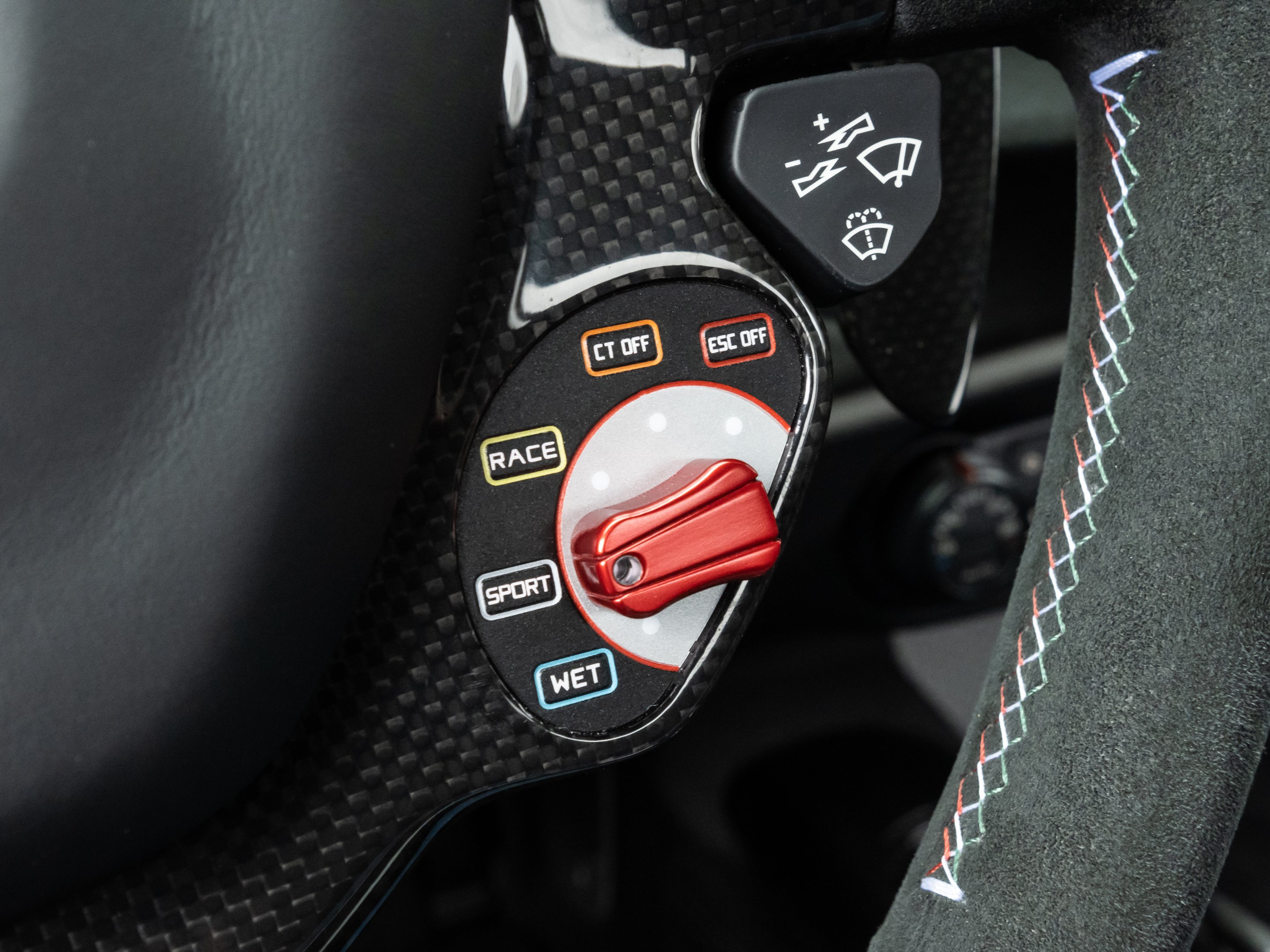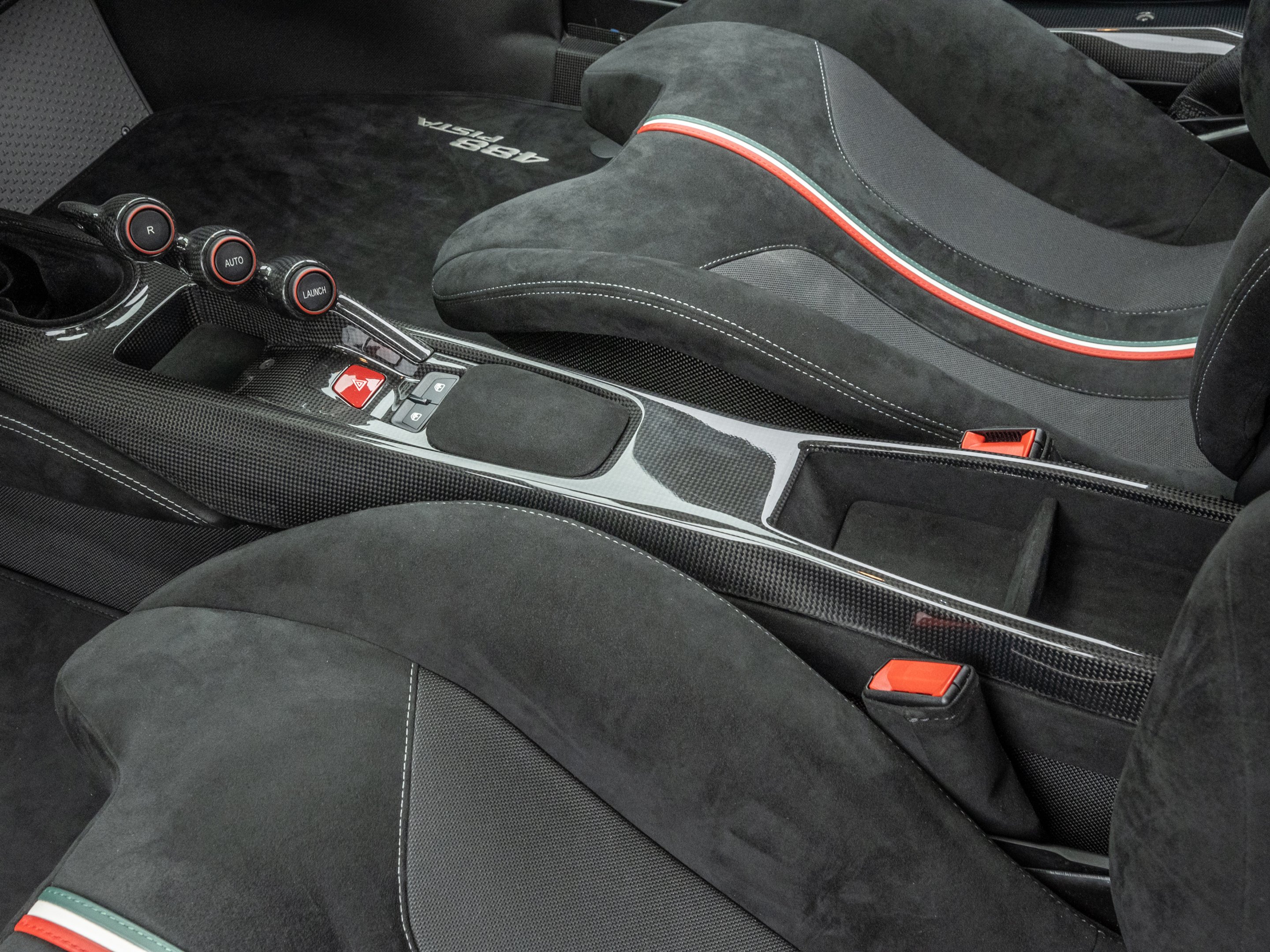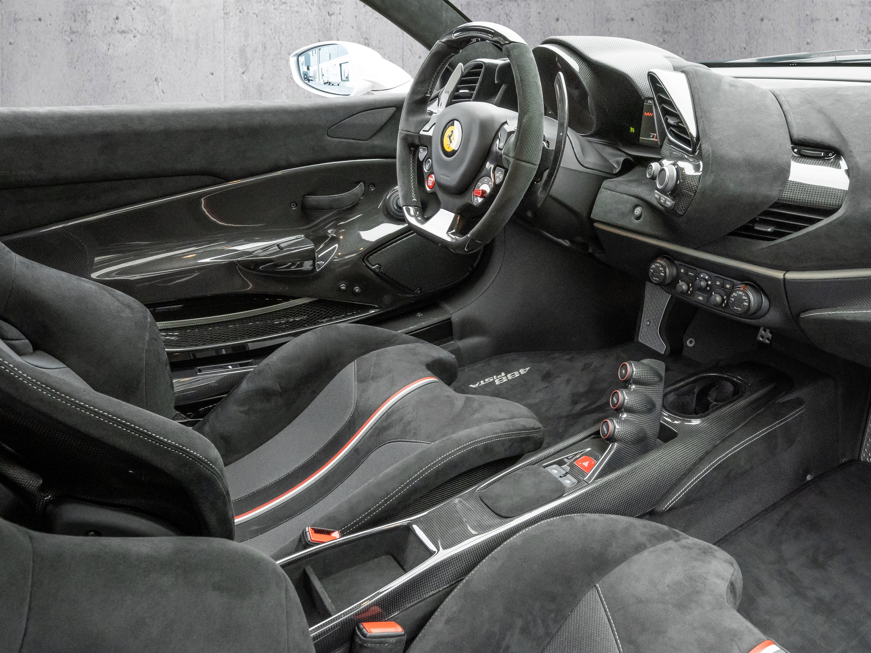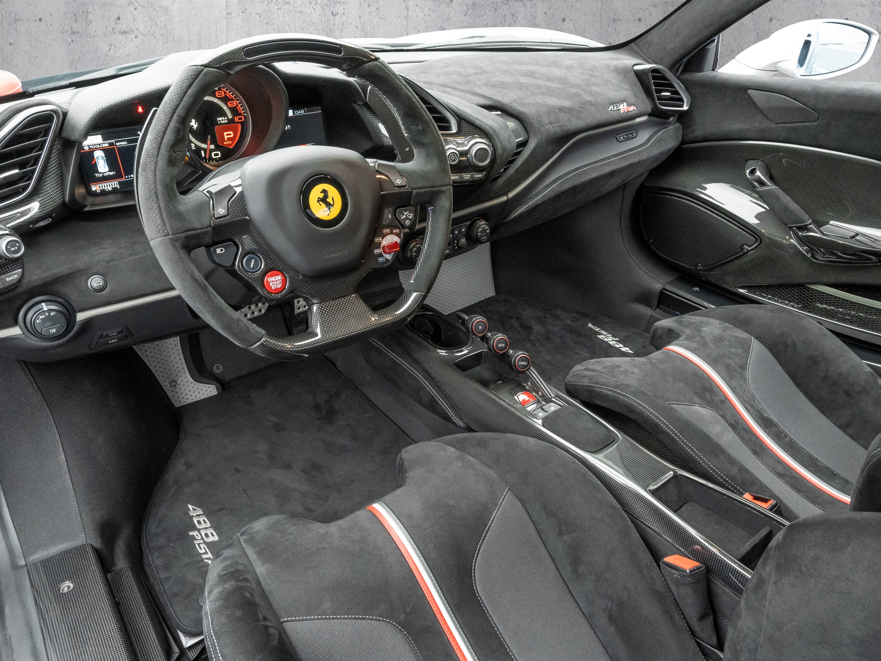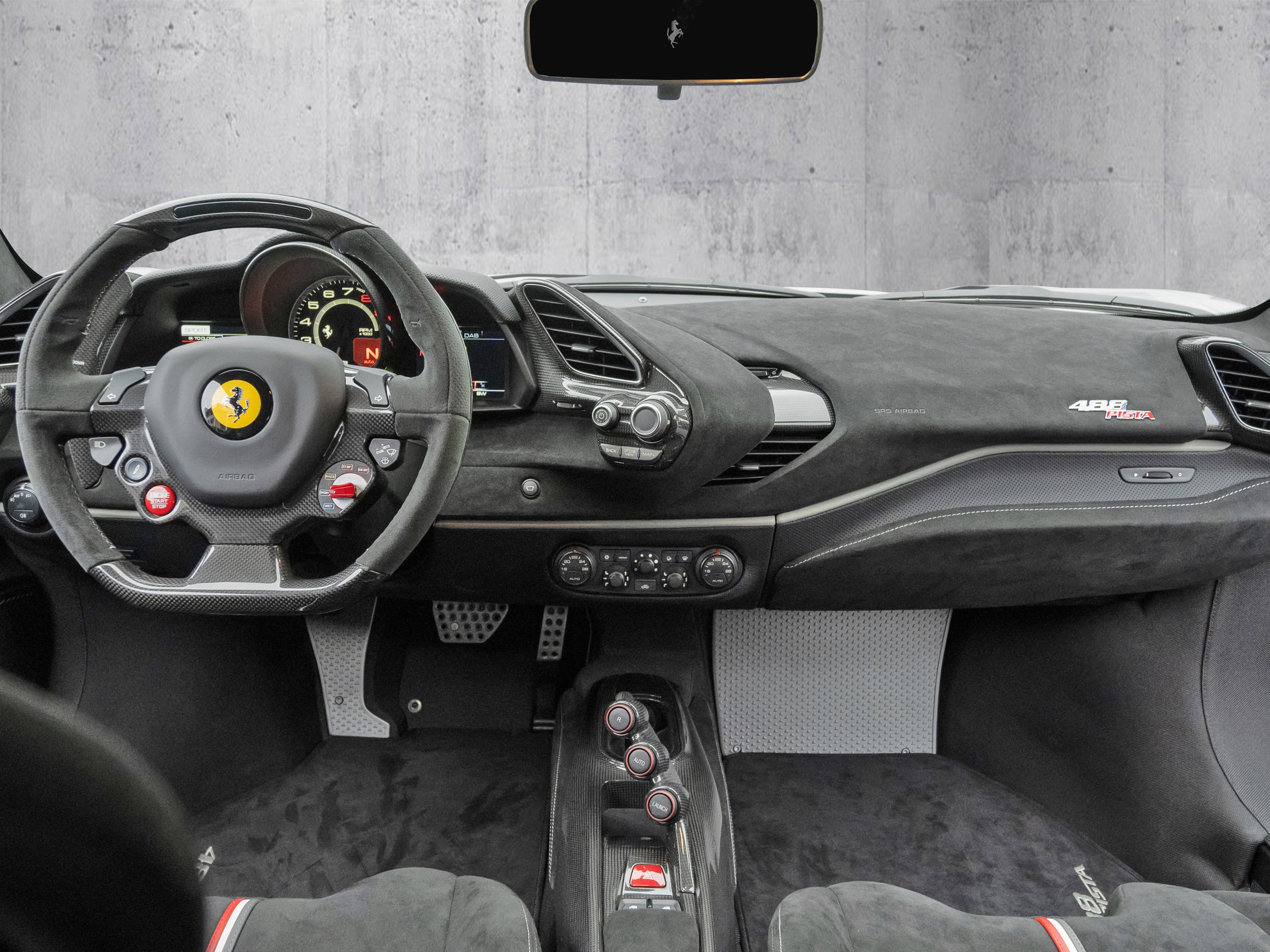 Hintere Parkkamera, Bremssättel in Giallo Modena, Spoiler und Klappen vorne aus Carbonfaser, Splitter seitliche Luftklappen aus Carbonfaser, Motorraum aus Carbonfaser, Diffusor aus Carbon, Seitliche Spoiler aus Carbonfaser, Schwellerverkleidung aus Carbonfaser, Auspuffrohre aus Titan, Hinterer Bereich aus Carbonfaser, Scuderia Ferrari Embleme auf den Kotflügeln, Äußere Einstiegsleiste aus Carbonfaser, Finish Carbonfaser oberer Tunnel, Coloured Innenraum-Details, CLDT in Pelle Extracampionaro, Farbe der Bodenverkleidung, Striscia Sedili Pelle Tricolore, Auf die Nackenstütze genahtes Cavallino Rampante, Fußmatten mit gesticktem Fahrzeuglogo, Volante con Cuciture Tricolore, Rennsitze aus Carbonfaser, Sondernähte Farbe nach Wahl, Lenkrad aus Leder in Farbe nach Wunsch, AFS (Adaptive Frontscheinwerfer), Front-Lift, Funktionelle Ausstattung (kein Navigationsgerät), HELE-System (High Emotion Low Emission), Satelliten-Navigationsgerät, Personalisierungspaket, Integriertes Audio-System