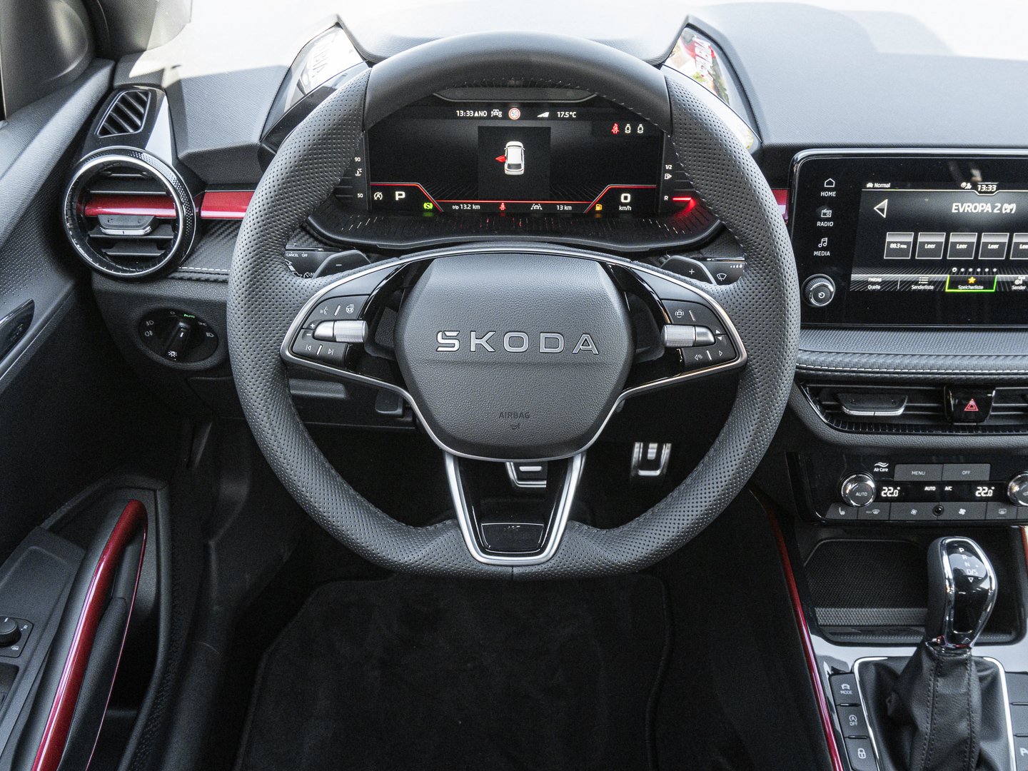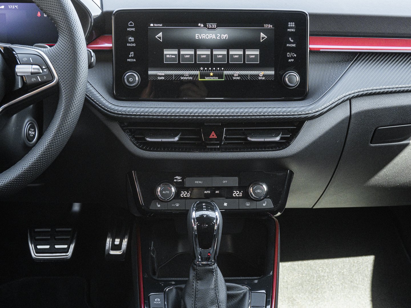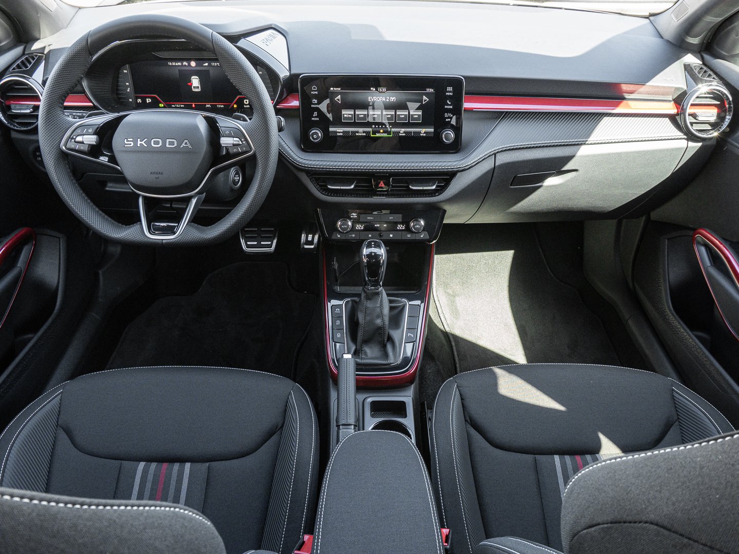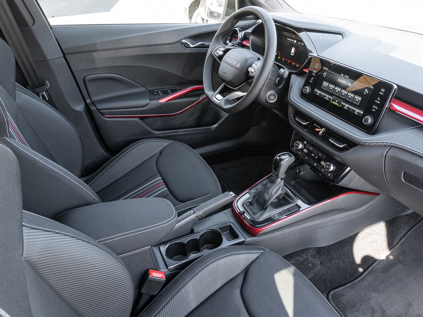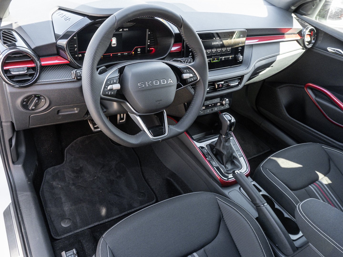 EM2 Aufmerksamkeits- und Müdigkeitserkennung, 8RL 4 Lautsprecher vorn + 2 hinten inkl. koda Surround, 8VG LED SBBR Low LED, 9P9 Gurtanlagesignalisation für die vorderenund hinteren Sitze, 9WJ SMARTLINK (wired and wireless connect), I8U KODA Infotainment, 9ZV Komfort Telefonie BT Kopplebox, EF1 Steuerung Fahrprofilauswahl, IN1 Steuerung Hinterachsgewicht, QK1 Multifunktionskamera (Für Fahrerassistenzsysteme), 3A2 ISOFIX-Verankerung auf dem Beifahrersitzund den äußeren Rücksitzen inklusive Top-Tether, 7P4 Einstellbare Lendenwirbelstützen in denVordersitzen, K8G Karosserievariante Kurzheck, 0I0 40l Kraftstofftank, 2C5 Lenksäule horizintal- und vertikal einstellbar, 3N6 Cargoelement im Kofferraum, 3NZ Rücksitzlehne 60:40 geteilt umlegbar, 4VN Emissionsnorm EU6e (EB), 5XR Sonnenblenden mit Spiegel auf Fahrerseite, 6K2 Frontradarassistent (Front Assist), 6SJ Gepäckraumwendematte - Zweiseitiger Bodenbelag (Teppich/gummiert), 7L6 Start-Stopp-Automatik mit Rekuperation (Bremsenergierückgewinnung), YOK Care Connect (3 Jahr Laufzeit), 9AK Klimaanlage Climatronic (2-Zonen) mit Allergenfilter und Geruchsfilter, NZ4 Notruffunktion eCall+, 6XK Elektrisch einstell- beheiz- und anklappbare Außenspiegel, U9E 2 USB-Anschlüsse vorn und 2 USB-Ladeanschlüsse hinten, 8S7 2 Leseleuchten vorn 2 hinten, FM9 Steuerung Varianten, QQ8 LED-Ambientebeleuchtung vorn, 5MT Dekorleiste in Red-Metallic, 6FH Außenspiegelgehäuse in Kontrastlackierung, A8F Ausstattungslinie Monte Carlo, CI8 16 Leichtmetallfelgen Proxima Schwarz glanzgedreht, N4A Interieur aus Stoff kombiniert mit hochwertigen Materialien, DS9 1.5l TSI ACT 110 kW / 150 PS, N09 1.5l TSI (4-Zylinder Ottomotor)