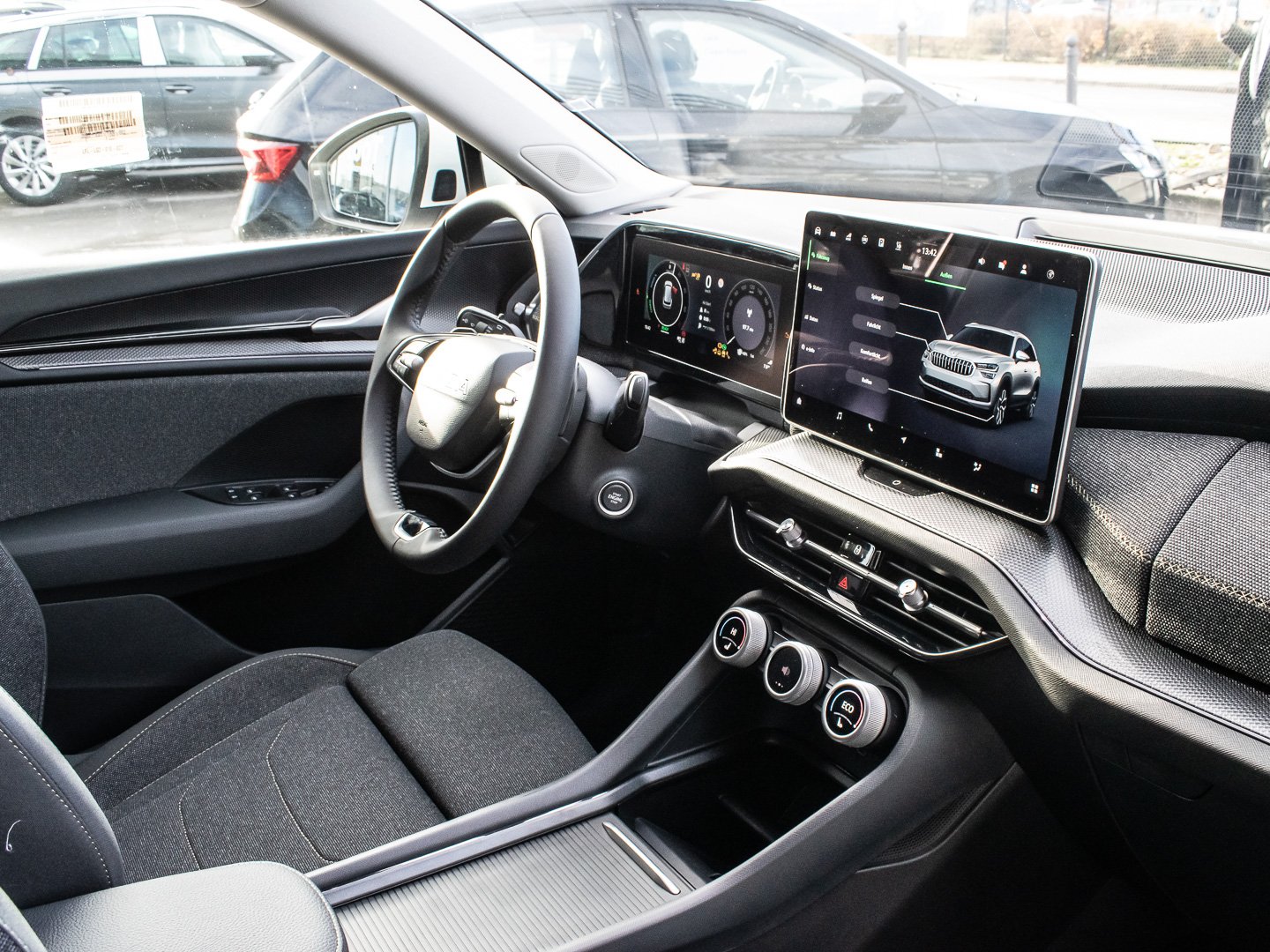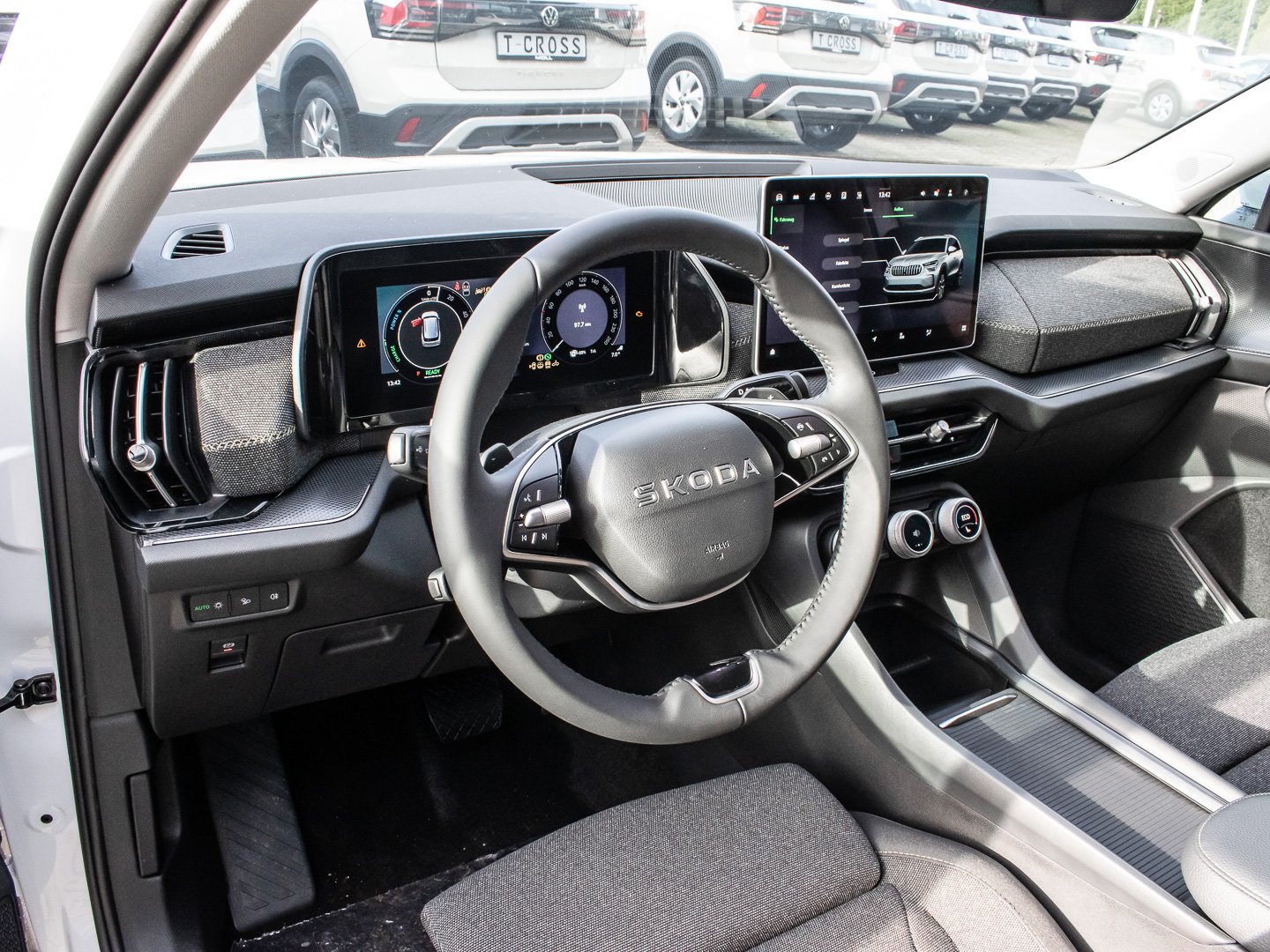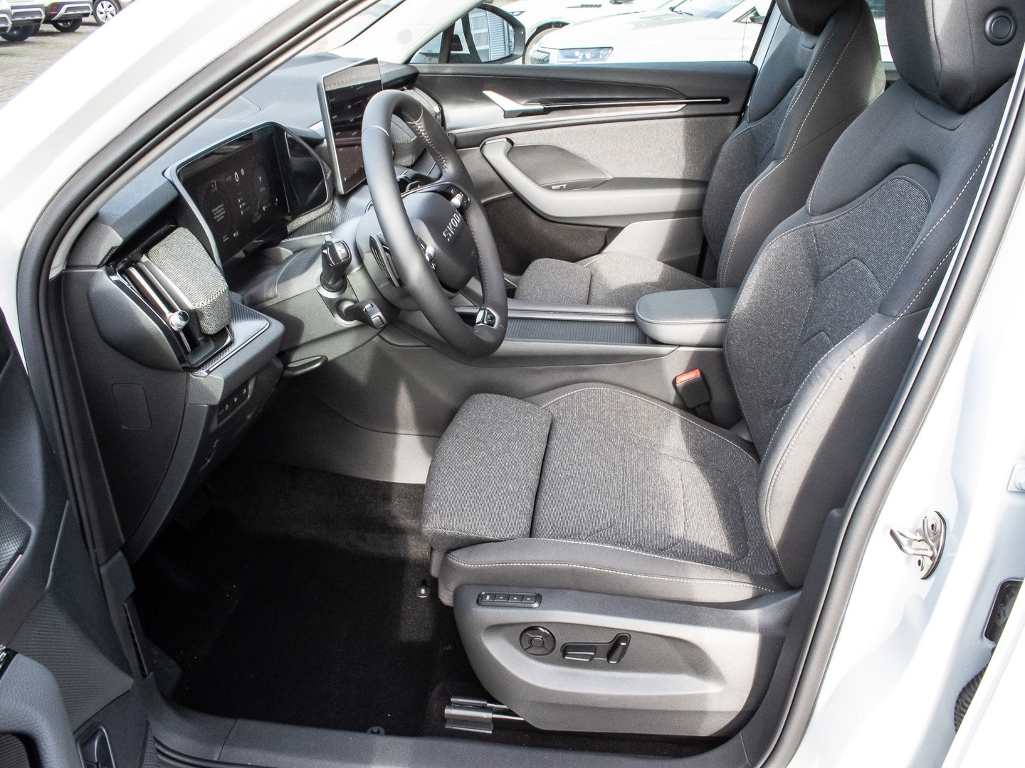 Bedienschalter Digitale Drehregler (Smart Dials), Induktionsladeschale für Smartphone 15 W, Infotainment-System mit 13 Display, Kreuzungs-Assistent (Crossroad Assist), Schadstoffarm nach Abgasnorm Euro 6e, Sitzbezug / Polsterung: Stoff Loft schwarz, Stossfänger vorn mit Unique Dark Chrom-Applikationen, Vorbereitung für Alkohol-Wegfahrsperre (Alcolock), Radstand Standard, Adaptive Fahrwerksregelung (DCC Plus) inkl. Fahrprofilauswahl (Drive Mode Selector), Intelligente Geschwindigkeitsanpassung (ISA) inkl. Speed-Limiter, Schliess-/Startsystem Kessy inkl. Diebstahl-Warnanlage, Interieur-Design-Paket Loft, Hybrid 150 kW (Motor 1.5 Ltr. - 110 kW TSI), Ladekabel mit Schukostecker (Mode 2), Fahrprofilauswahl mit Soundgenerator, LM-Felgen 7x18 (Mazeno - Aero - Silber - glanzgedreht)