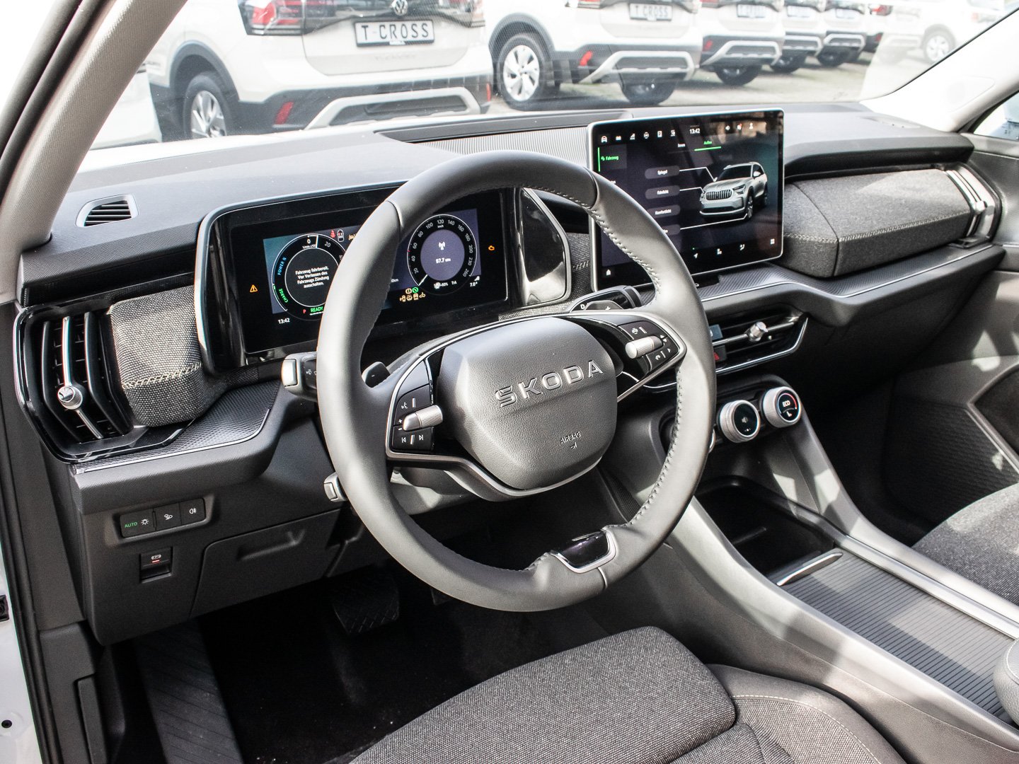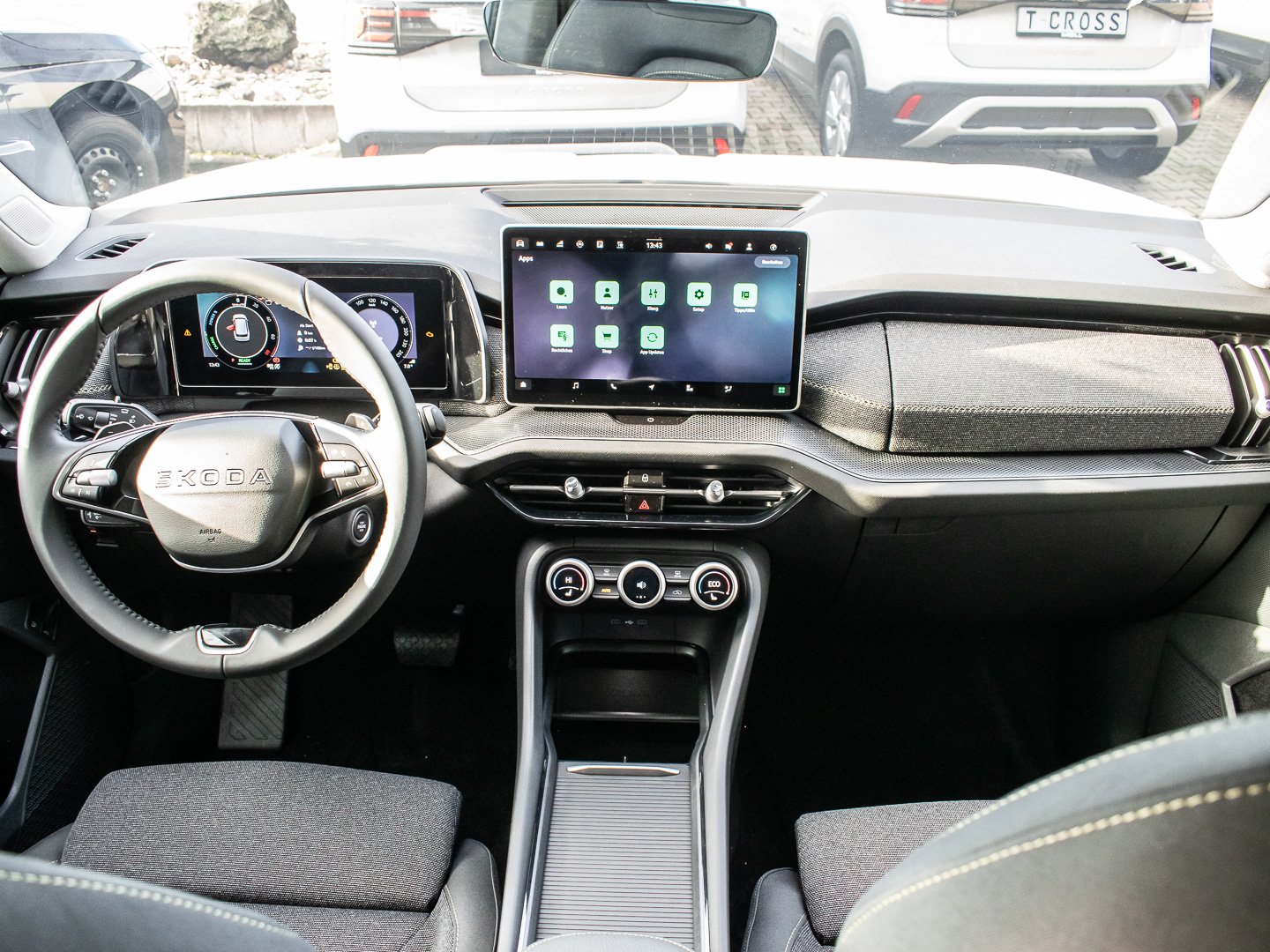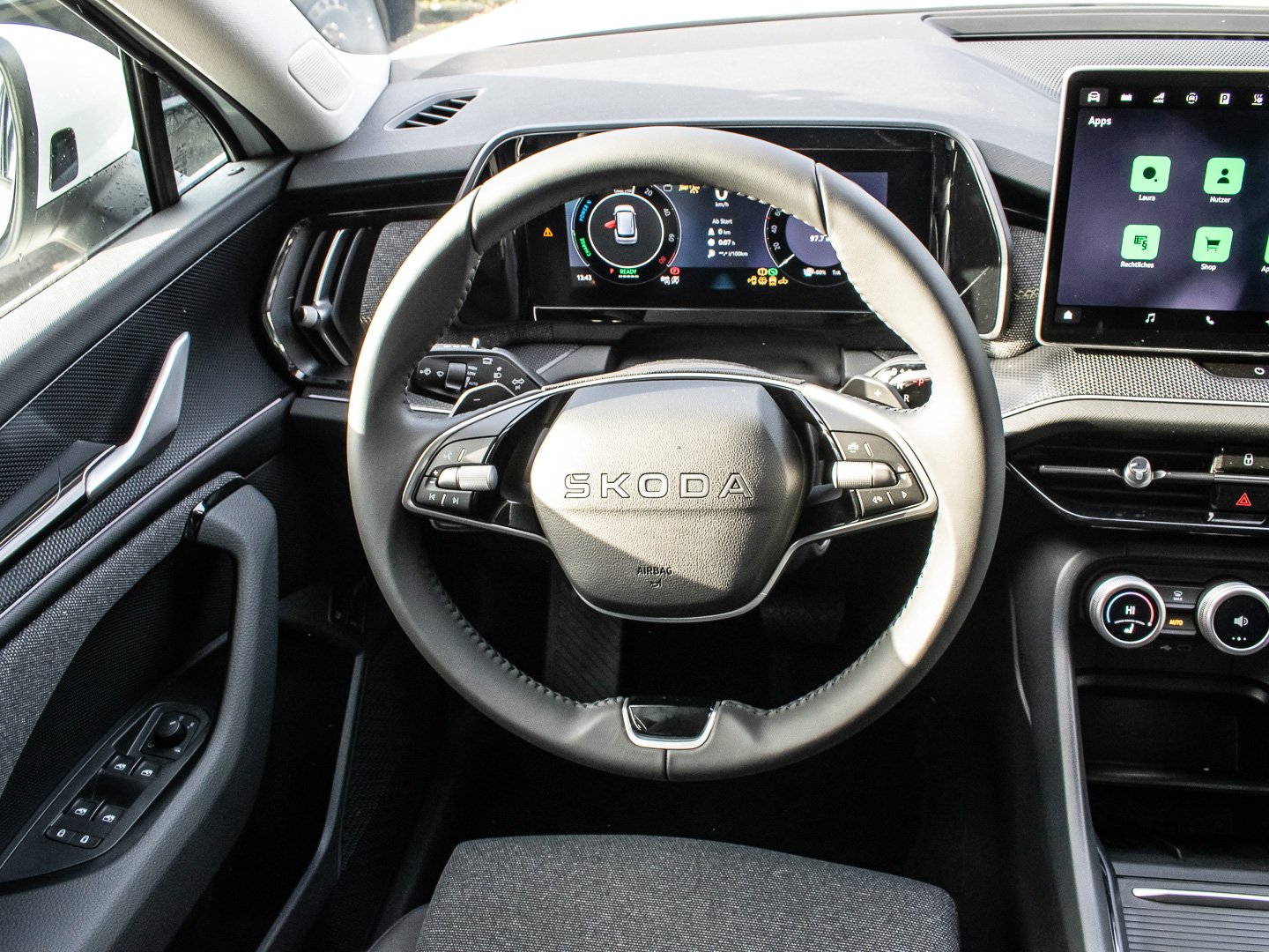 Bedienschalter Digitale Drehregler (Smart Dials), Induktionsladeschale für Smartphone 15 W, Infotainment-System mit 13 Display, Kreuzungs-Assistent (Crossroad Assist), Schadstoffarm nach Abgasnorm Euro 6e, Sitzbezug / Polsterung: Stoff Loft schwarz, Stossfänger vorn mit Unique Dark Chrom-Applikationen, Vorbereitung für Alkohol-Wegfahrsperre (Alcolock), Radstand Standard, Adaptive Fahrwerksregelung (DCC Plus) inkl. Fahrprofilauswahl (Drive Mode Selector), Intelligente Geschwindigkeitsanpassung (ISA) inkl. Speed-Limiter, Schliess-/Startsystem Kessy inkl. Diebstahl-Warnanlage, Interieur-Design-Paket Loft, Hybrid 150 kW (Motor 1.5 Ltr. - 110 kW TSI), Ladekabel mit Schukostecker (Mode 2), Fahrprofilauswahl mit Soundgenerator, LM-Felgen 7x18 (Mazeno - Aero - Silber - glanzgedreht)