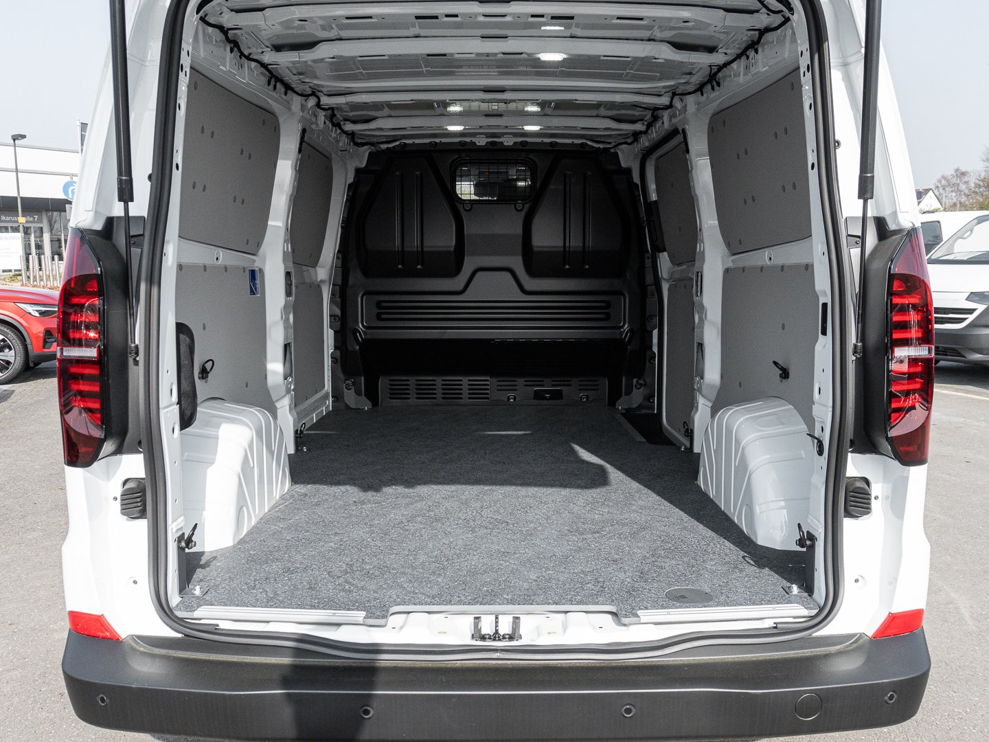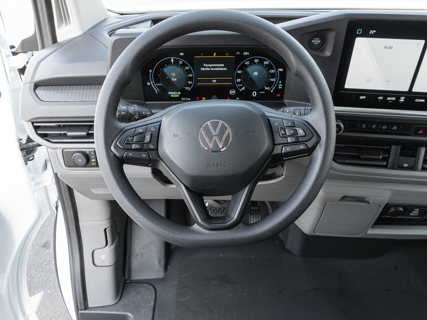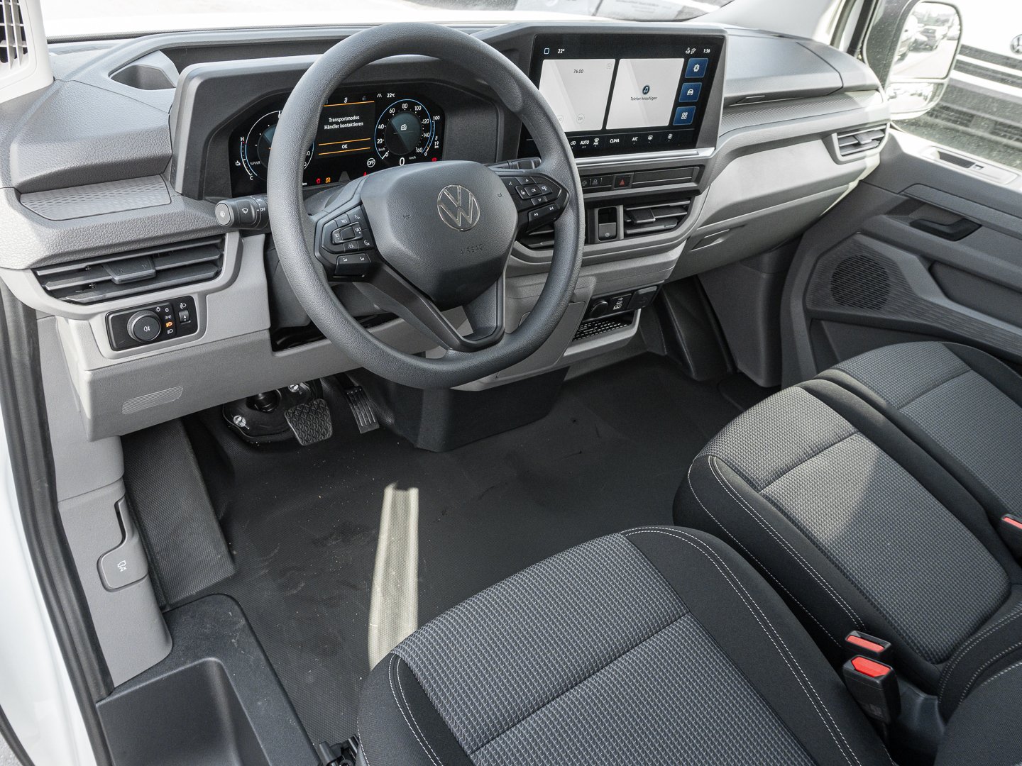 12T Fahrzeugklassen-Differenzierung -7TB, 2JB Stoßfänger vorn und hinten in Schwarz genarbt, 3L3 6-Wege Fahrersitz verstellbar, 3MJ Gummiboden im Fahrerhaus, 3TB Fahrerhaussitze, 4ZA Einstiegleiste Schiebetür Kunststoff in Schwarz, 5EA Vollständige Fahrzeugzulassung, 6H3 Außenspiegelgehäuse und Türgriffe in Schwarz genarbt, 7C3 Einstiegsgriff auf der Beifahrerseite an der A-Säule, 7M3 Einstiegleisten vorn Kunststoff in Schwarz, 7N1 Dachkonsole klein, 7P5 2-Wege Lendenwirbelstütze für den Fahrersitz manuell einstellbar, 7W1 Öffnungskonfiguration 1. Sitzreihe, 8IT LED Frontscheinwerfer inklusive LED Tagfahrlicht, 8J1 Notbremsassistent mit Fußgänger- und Radfahrererkennung mit Ausweichunterstützung & Abbiegeassistent, GC0 An- und Abwahlsteuerung Reserverad, GV1 Vorbereitung alkoholempfindliche Wegfahrsperre, GZ1 Schiebetür auf der Beifahrerseite, H0D Reifen 215/65 R16C 109 T, N2S Sitzbezüge in Stoff gestreift, NZ2 Notrufsysstem eCall, QL7 Seitenscheiben in Wärmeschutzglas, QR4 Verkehrszeichenerkennung und Falschfahrwarnung, VG8 Goodyear Ganzjahresreifen, VH0 Elektrische Klemmleiste 12-Polig, Y0D 5 Jahre Herstellergarantie für Deutschland, 8N1 Heckwischer mit Heckscheiben-Wischwaschanlage, GF0 Steuerung Innentrim, R28 Vorbereitet für VW Connect, YAA Steuerung Sitzpaket (Bestellung nur zur Änderung des Sitzpakets in Serie), Z02 Exterieurpaket genarbte Anbauteile Kühlergrill in Clear White, 5 Vorbereitung für Anhängevorrichtung, IA1 Fixierpunkt nach AMPS-Standard an der Mittelkonsole z. B. für Halterungen von mobilen Endgeräten, Z37 Fahrerhaus Sitzpaket 18A Einzelsitz in Stoff gestreift mit Beifahrerdoppelsitzbank, 0Z1 TW, 1AF Elektronisches Stabilisierungsprogramm ESP und elektromechan. Bremskraftverstärker, 33A Beifahrerdoppelsitzbank mit Unterladefunktion, 3J7 2-Wege Kopfstützen höhenverstellbar, 6CE Elektrische Zusatzheizung (für BEV und PHEV), 6KC Aktive Kühlergrillöffnung/-Schließung, 6Q3 Schalthebel für Automatikgetriebe am Lenkrad, 3-Phasig 32 A, Kabellänge 5 m, 7B3 12V-Steckdose in der Mittelkonsole vorne und eine 12V-Steckdose an D-Säule auf Bodenhöhe hinten rechts, 7H7 Höchstgeschwindigkeit gemäß technischer Beschreibung, 7Q0 Radio 33 cm (13 ) Touch-Farbdisplay und Wireless App-Connect (Apple & Android), J4E EFB-Fahrzeugbatterie 75 Ah, M27 Elektro-Motor 160 kW / 218 PS mit 415 Nm, Q2L Fahrerhaus Sitzpaket 7 Einzelsitz in Stoff gestreift mit Beifahrerdoppelsitzbank, T23 Elektrischer Motor, 0WS Zulässiges Gesamtgewicht 3.245 - 3.350 kg, 5DC Seitenverkleidung aus Kunststoff im Laderaum, 2 zusätzliche bei Heckflügeltür, 2QA Schriftzug Transporter am Heck, 4RA Gurtstraffer für den Fahrersitz und Beifahrersitz, bei Beifahrerdoppelsitzbank nur außen, 6B4 8 Verzurrösen zur Ladegutsicherung im Laderaum, 6X1 Haltegriffe am Dachrahmen auf der Fahrer- und Beifahrerseite, KC0 Klimaanlage im FH (1 Zone mit autom. Regelung), QJ1 Exterieurpaket genarbte Anbauteile, U9D 7x USB im Fahrerhaus, 3CG Trennwand aus Metall, hoch mit Fenster, volle Höhe, 9E3 Superhelle LED-Leuchten im Laderaum 3x bei Kasten, Zierleiste schwarz genarbt, 3D1 Mittelkonsole schmal mit Cupholder+Ablage für Mobiltelefon, Kühlergrill in Clear White, 8RG 4 Lautsprecher (2 Lautsprecher in der Instrumententafel und 2 Lautsprecher in den Fahrerhaustüren, 8S5 LED-Leuchten für das Fahrerhaus, 8T5 Geschwindigkeitsregelanlageintellig.Geschwindigkeitsassistent, 8Y0 Eintonsignalhorn, 8YQ Digitales Co